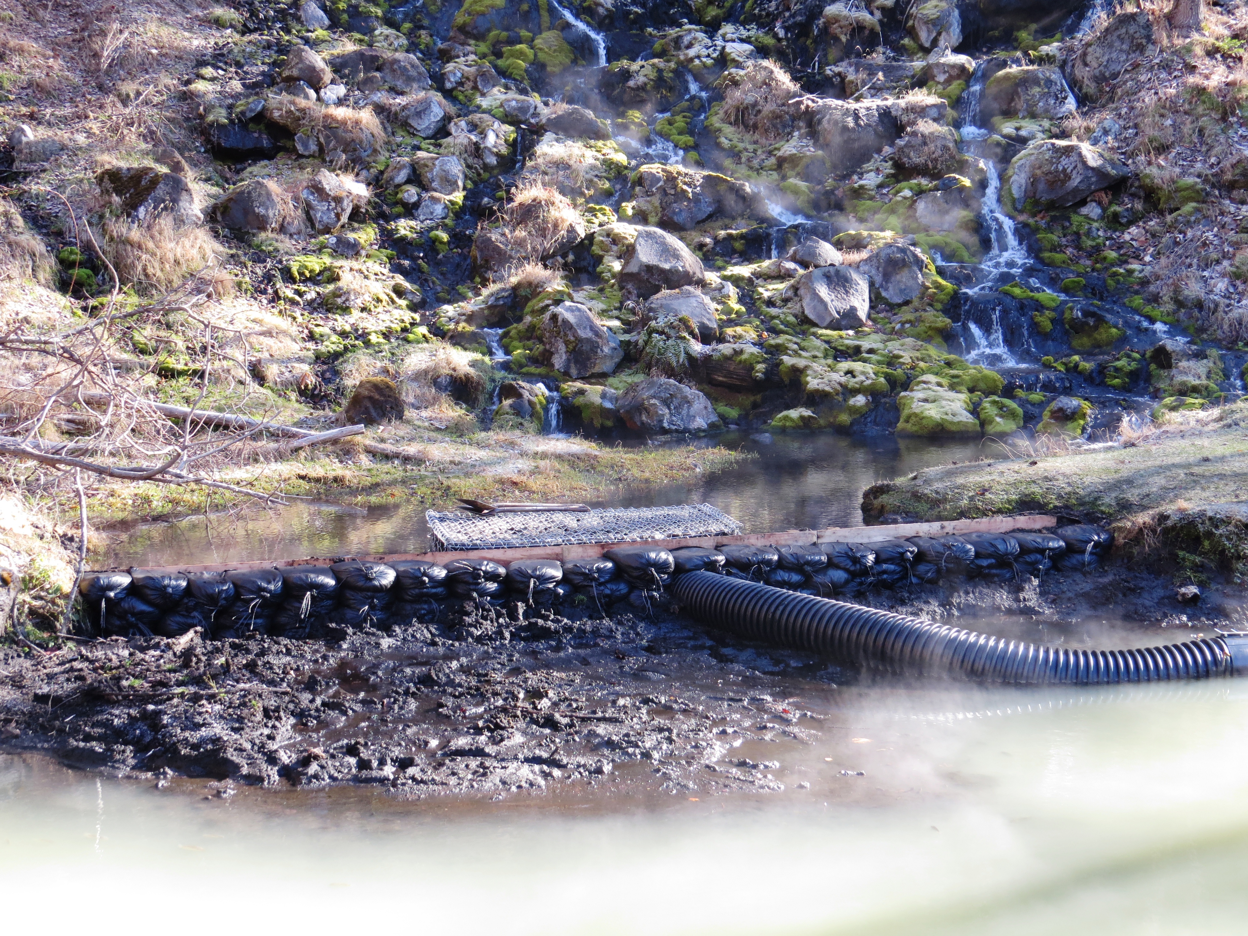 平成25年は、事前調査を行い、外来魚の生息する池に流入する滝からの温泉水を、堰を設けて下流へ迂回させる対策を実施しました。