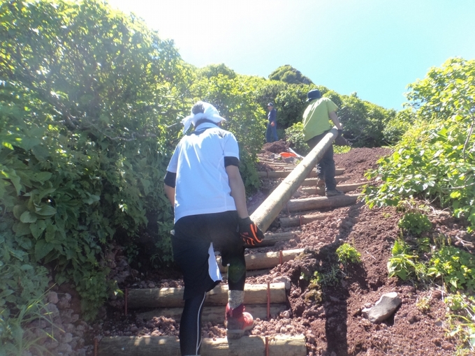 さて、時は遡る事7月9日。鴛泊登山道で毎年恒例の補修作業を実施しました。作業は利尻富士町役場や林野庁、環境省などの合同で行われ、計14名で土留に使用する丸太などの資材運搬や携帯トイレブースの塗装、標柱の補修作業などを行いました。