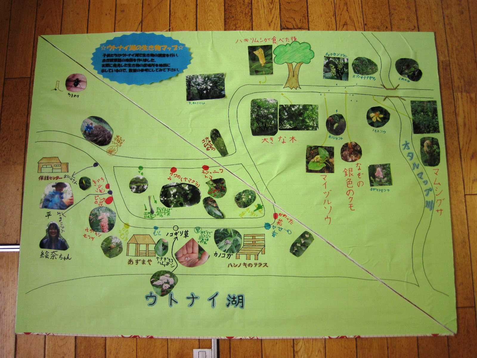子供達が真剣に制作してくれて完成した地図は、センターの図書コーナー横に展示していますので、ウトナイ湖にいらっしゃる際は地図で生き物の発見ポイントを確認してから散策にご出発ください。