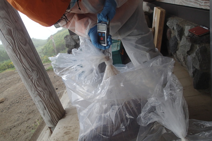 2重にした袋の3分の1程汲んだら、外に出し、重さを計って記録します。