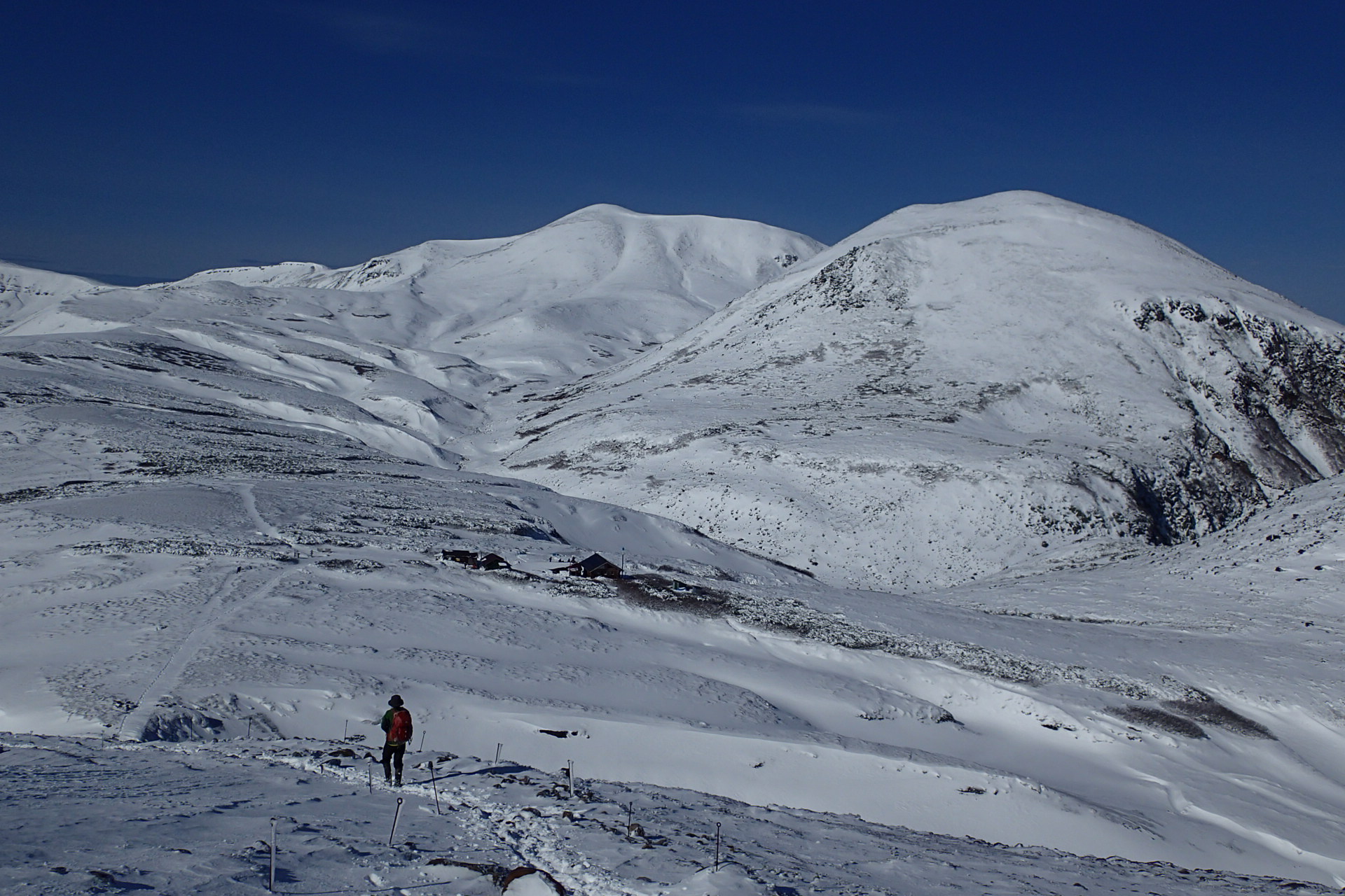 青い空、白い雪、黒岳石室は営業終了