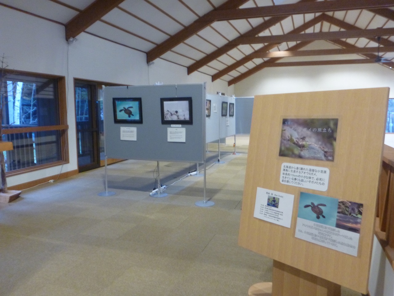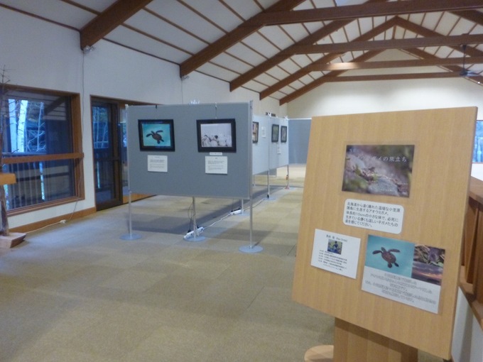 11月2日~12月28日の期間は、当方の写真展を行っています。テーマは「アオウミガメの旅立ち」で、内容は当方がアクティブレンジャーになる前に小笠原で体験した活動になります。直径約10cmの子ガメが懸命に生きている姿を見て頂けたらと思います。一部のブースでは道東の野生動物をテーマに、キタキツネや遡上中のサケなどの写真も展示しているのでこちらも是非ご覧ください。
