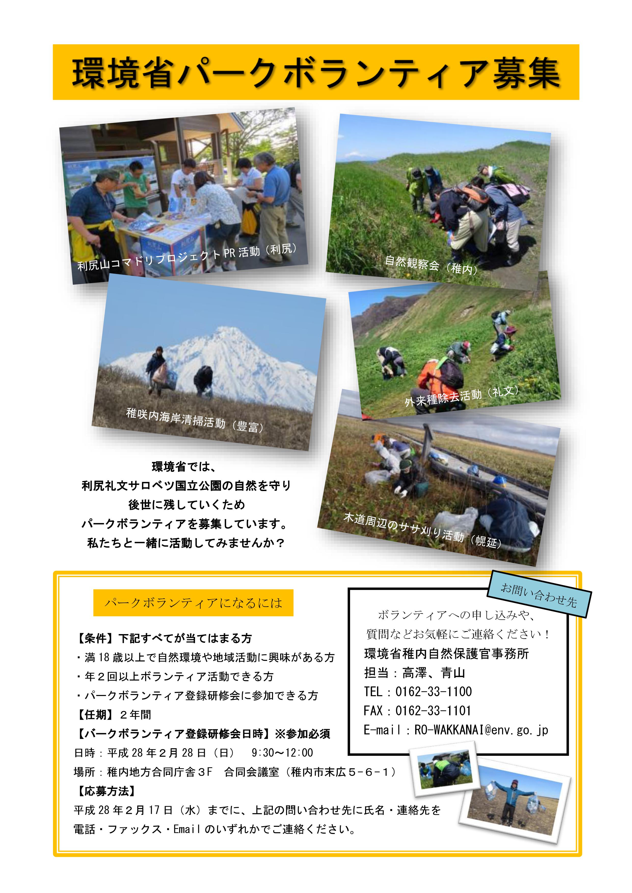 利尻礼文サロベツ国立公園のパークボランティアになるためには、2月28日に開催される「パークボランティア登録研修会」への参加が必要となります。詳細は、下記の「環境省パークボランティア募集」ポスターに記載されてある通りです。興味のある方は、ぜひポスターと次のリンクをご覧ください。