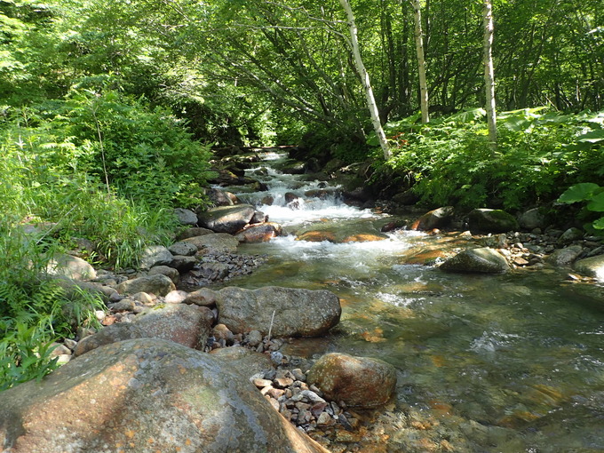 入山後、しばらくは沢沿いの道です。この日は水量が少なく、沢の渡渉はすべて長靴で突破しました。沢のせせらぎと森の木陰に癒やされ快適に歩けました。その後、尾根を直登し稜線上に出ます。