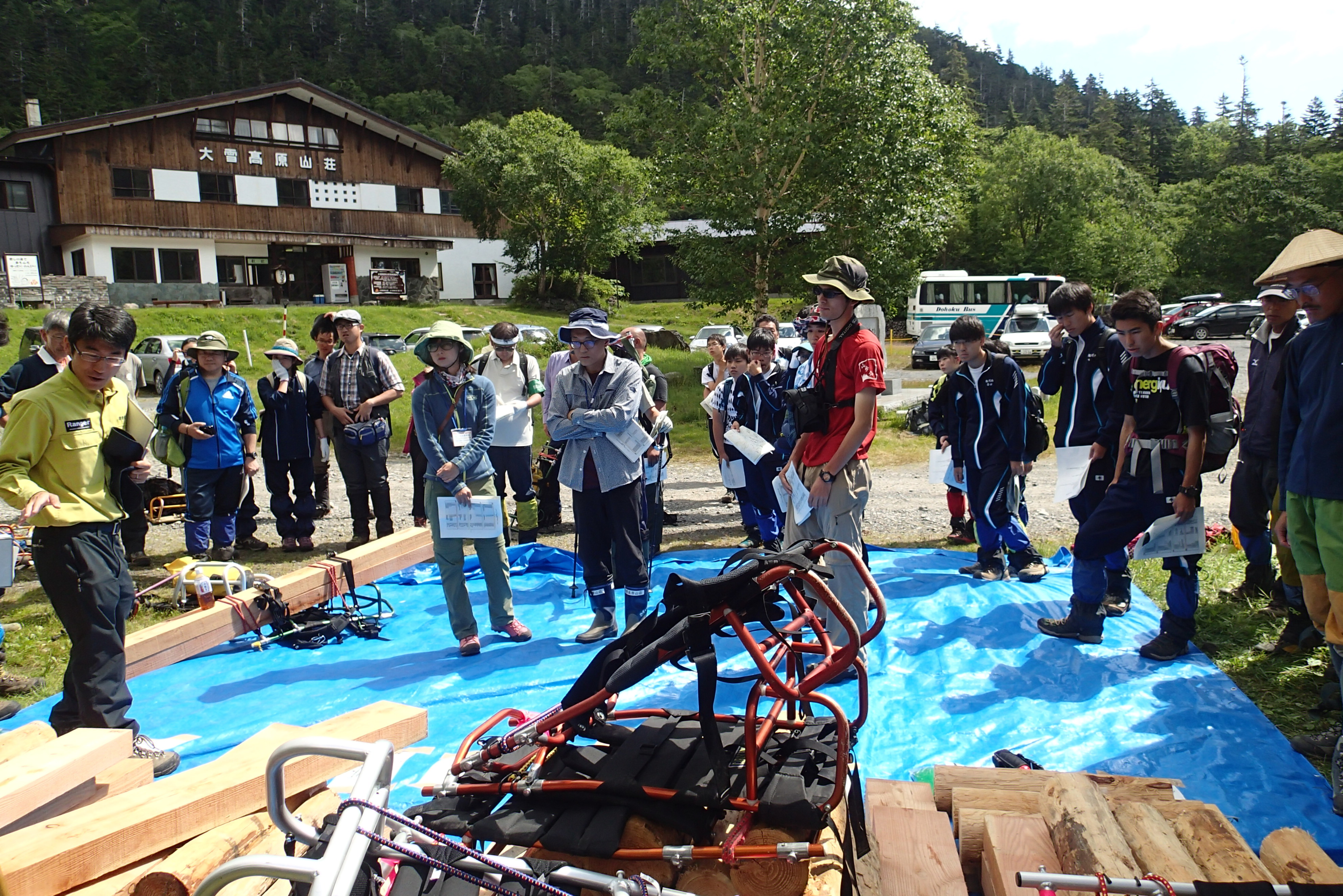 当日は、旭川西高校や上川高校の山岳部、北海道大学、上川山岳会、大雪山パークボランティア、大雪山自然学校、層雲峡ビジターセンター、にも協力してもらい、上川地区登山道等維持管理連絡協議会、大函森林事務所、上川総合振興局、上川自然保護官事務所と合わせて37名が参加。4班に分かれ、角材や丸太を、バショウ沼までの指定された場所まで運びました。今後、これらの資材をもとに、登山道を補修してぬかるみ対策を行う予定です。