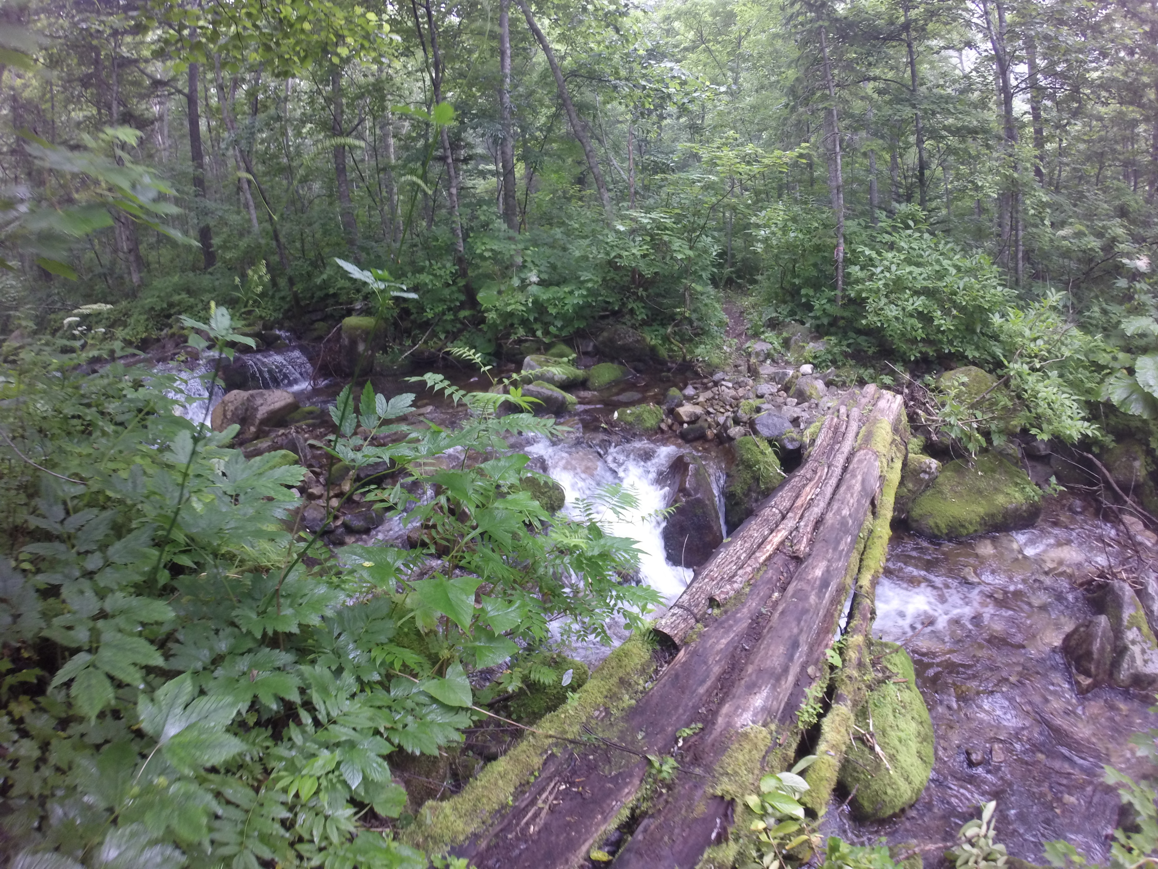 日高の山は沢登りから始まりますが、十勝幌尻岳の沢は随所に写真のような丸太橋がかけられていますので、山頂までは登山靴で登ることができます。沢沿いは涼しく、快適でした。