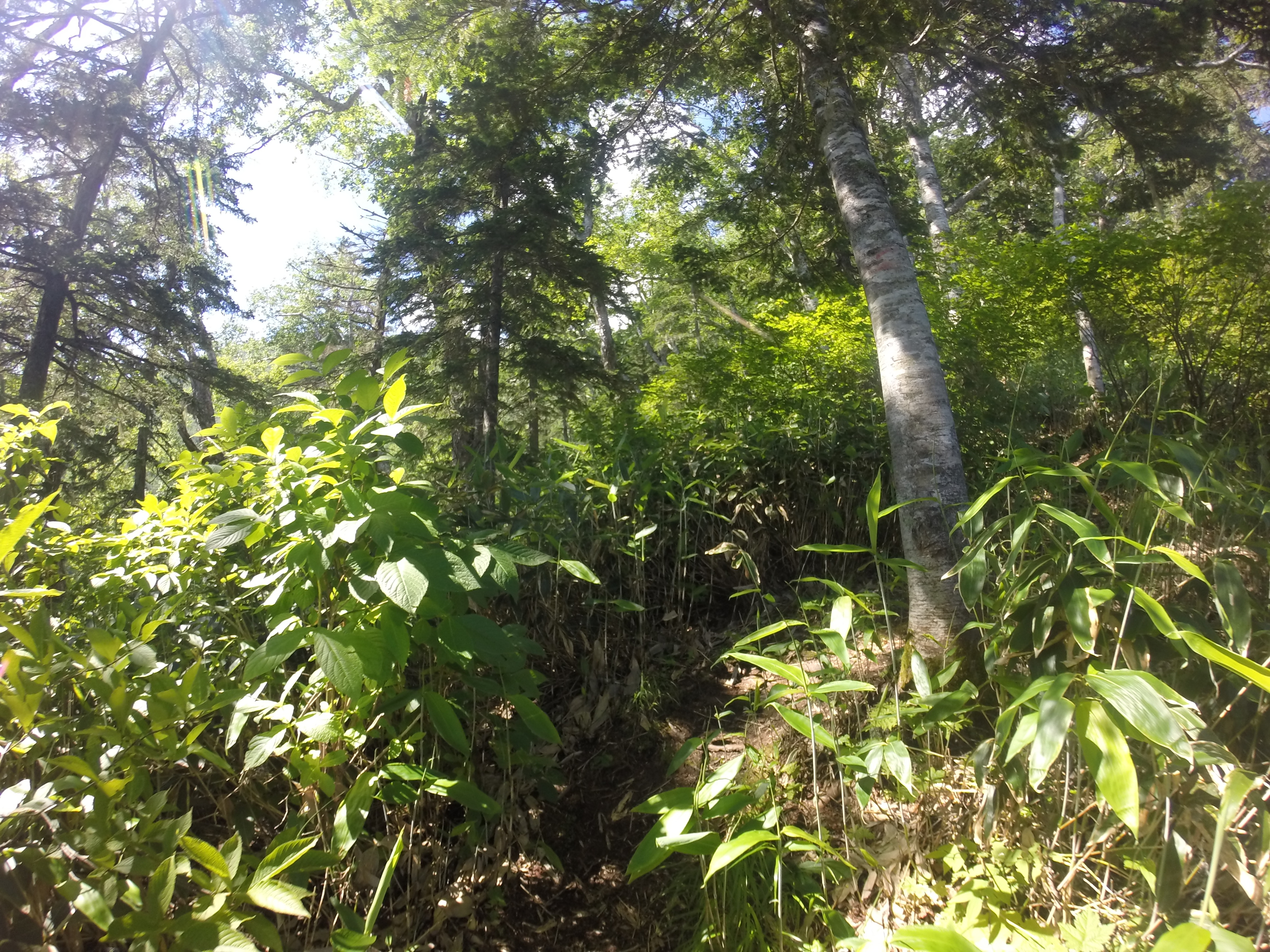 沢から離れると、日高の名物「急登」が待ち受けています。斜度はきついながらも、ササの刈払いが行き届いているので、一歩一歩に集中して黙々と登ります。山頂に近づくと日射が強くなり、暑くなってきました。