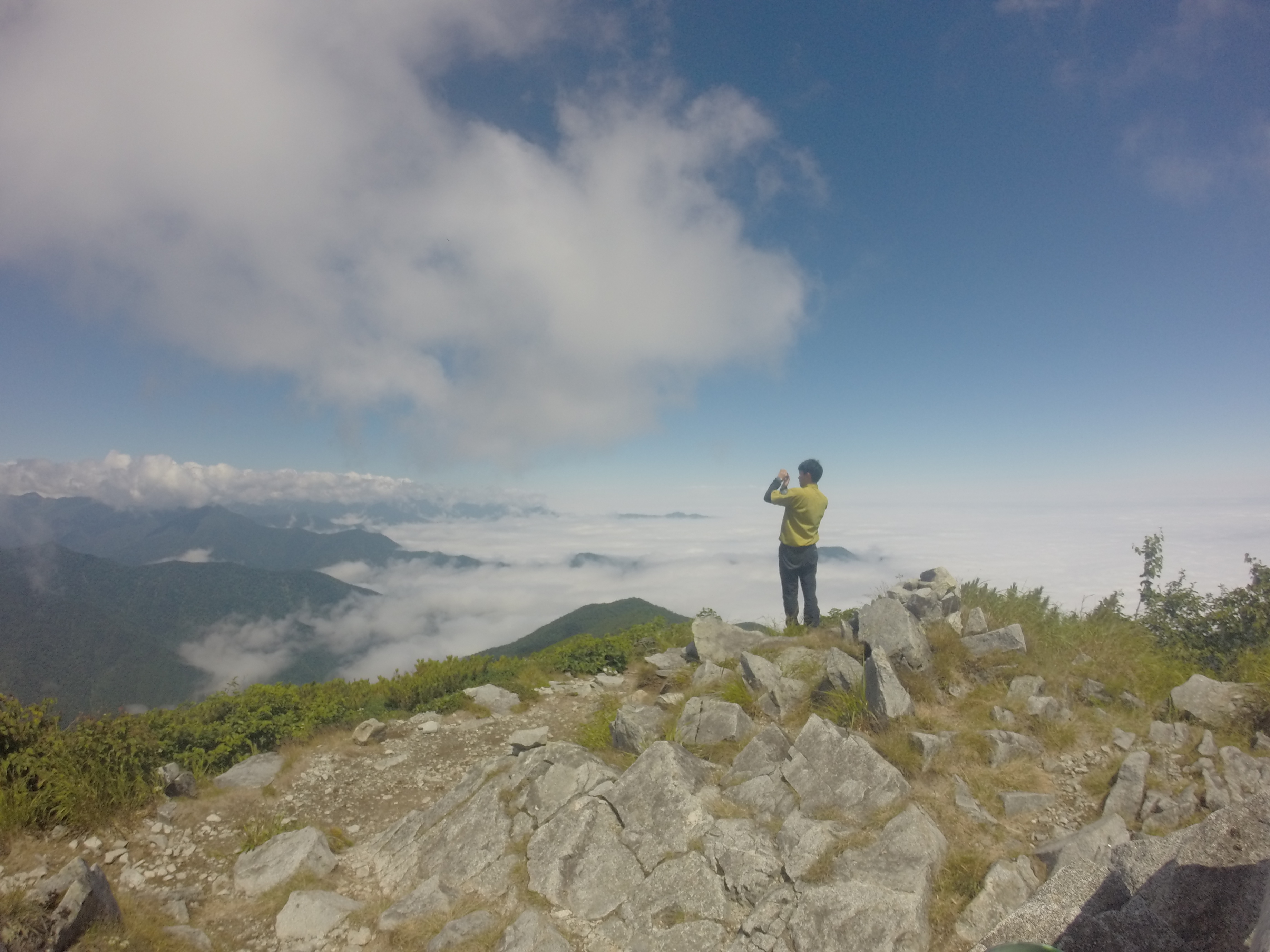 山頂に到着すると、十勝平野に広がる大雲海と南北に連なる日高山脈を望むことができました。しばらくすると、地元の中学生達が登ってきました。3年に1度の学校の行事だそうです。百名山の幌尻岳は、一般ルートでも2泊3日必要でハードルが高い経験者向きの山です。一方で十勝幌尻岳は、日帰りで登れるので登山初心者でも挑戦できる山です。初夏には登山道が雪渓に覆われていることもあるようですが、10月頃の紅葉が素晴らしい時期に登ってもいいかもしれませんね。