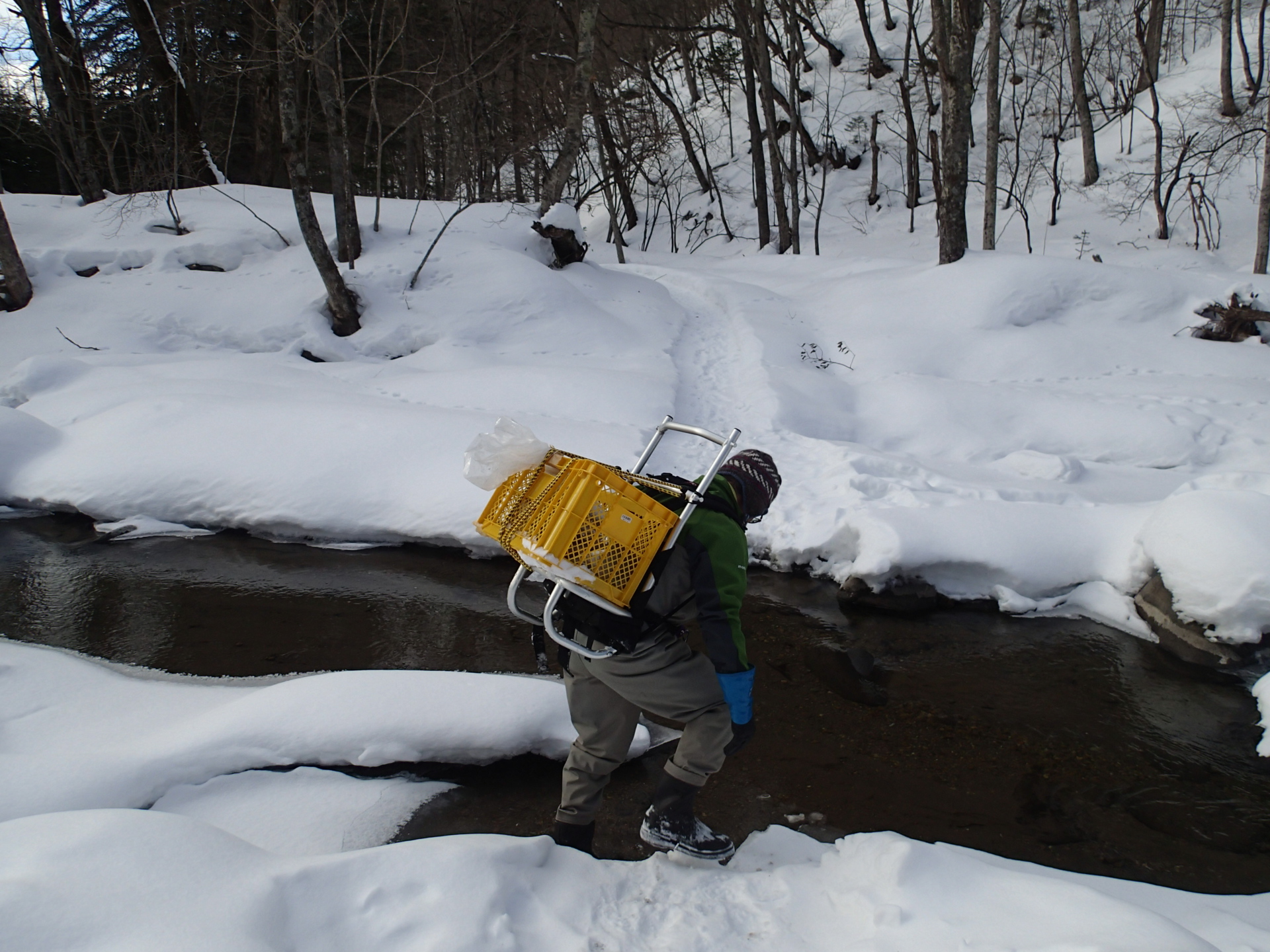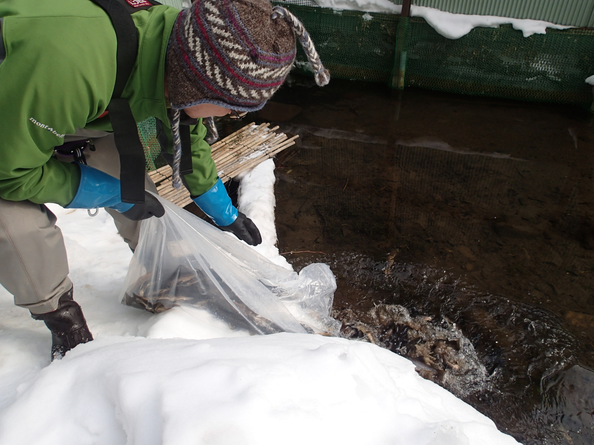 この日は、十勝のとある森の中にある池に30kg分の魚を運びました。背負子にコンテナを括り付け厚手のビニール袋を広げて魚を入れます。魚を活かす水も背負うのでずしりと肩に重さがかかります。数にすると100匹以上でしょうか。二人で二往復。シマフクロウたちには、お腹を満たし、寒さが厳しくとも繁殖の大切な季節を乗り切ってほしいものです。