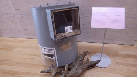 保護増殖活動のもうひとつの柱は巣箱掛けですが、こちらの写真は設置していた木が倒れて一部が壊れてしまった巣箱を、ひがし大雪自然館での展示に利用しようと加工中のものです。壊れた部分を切り取って、断熱材が施されていることなどを断面展示します。出入口に残るシマフクロウの爪痕なども感じることができます。完成間近、乞うご期待です。