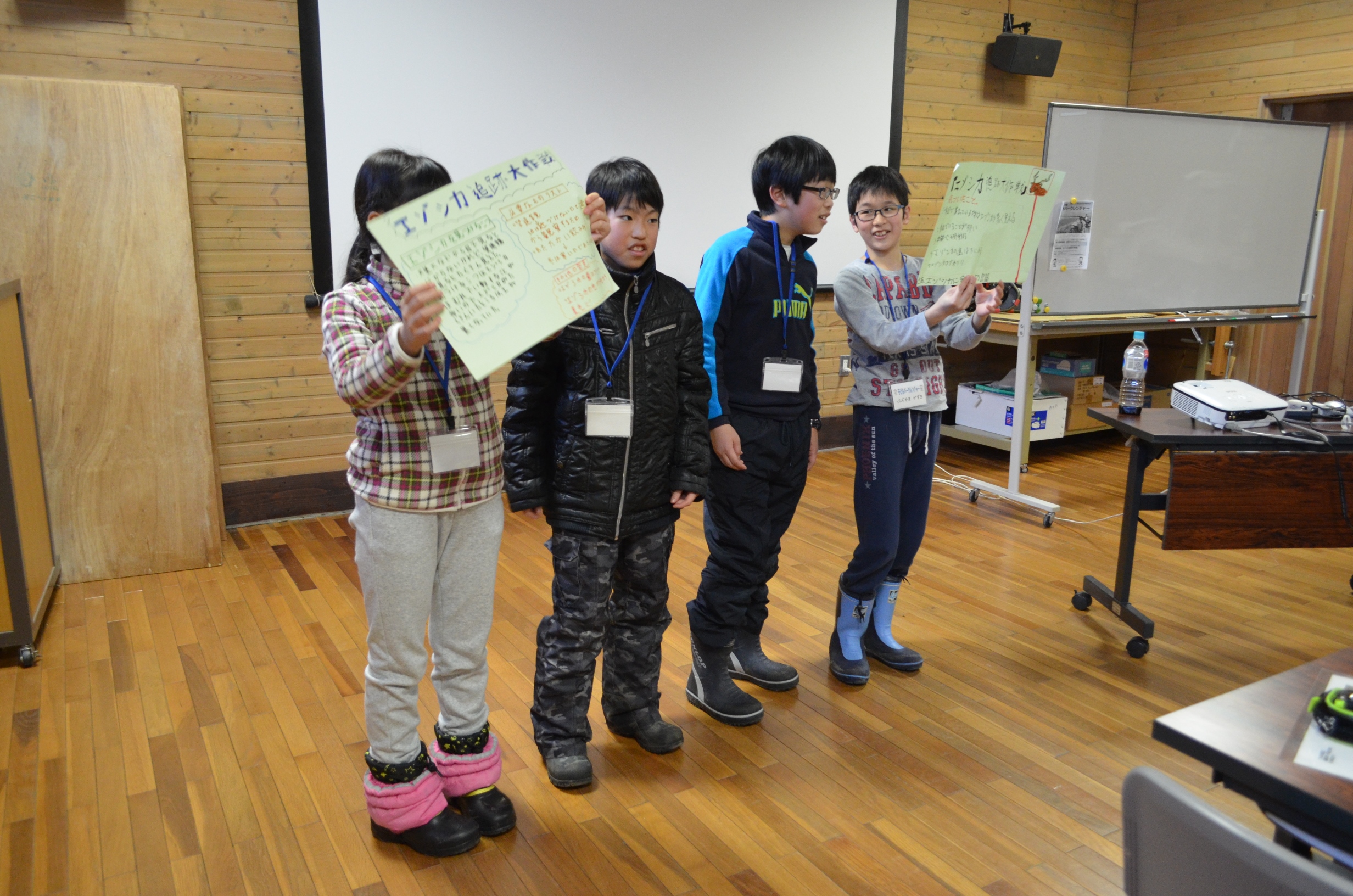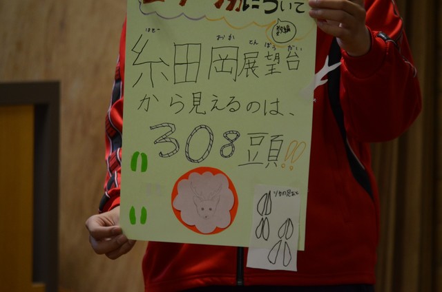 最後は、発表会!前に出て、エゾシカの大発見を報告しました。緊張しないのかな?どの班も、笑顔でハキハキ、本当にすばらしい発表でした!