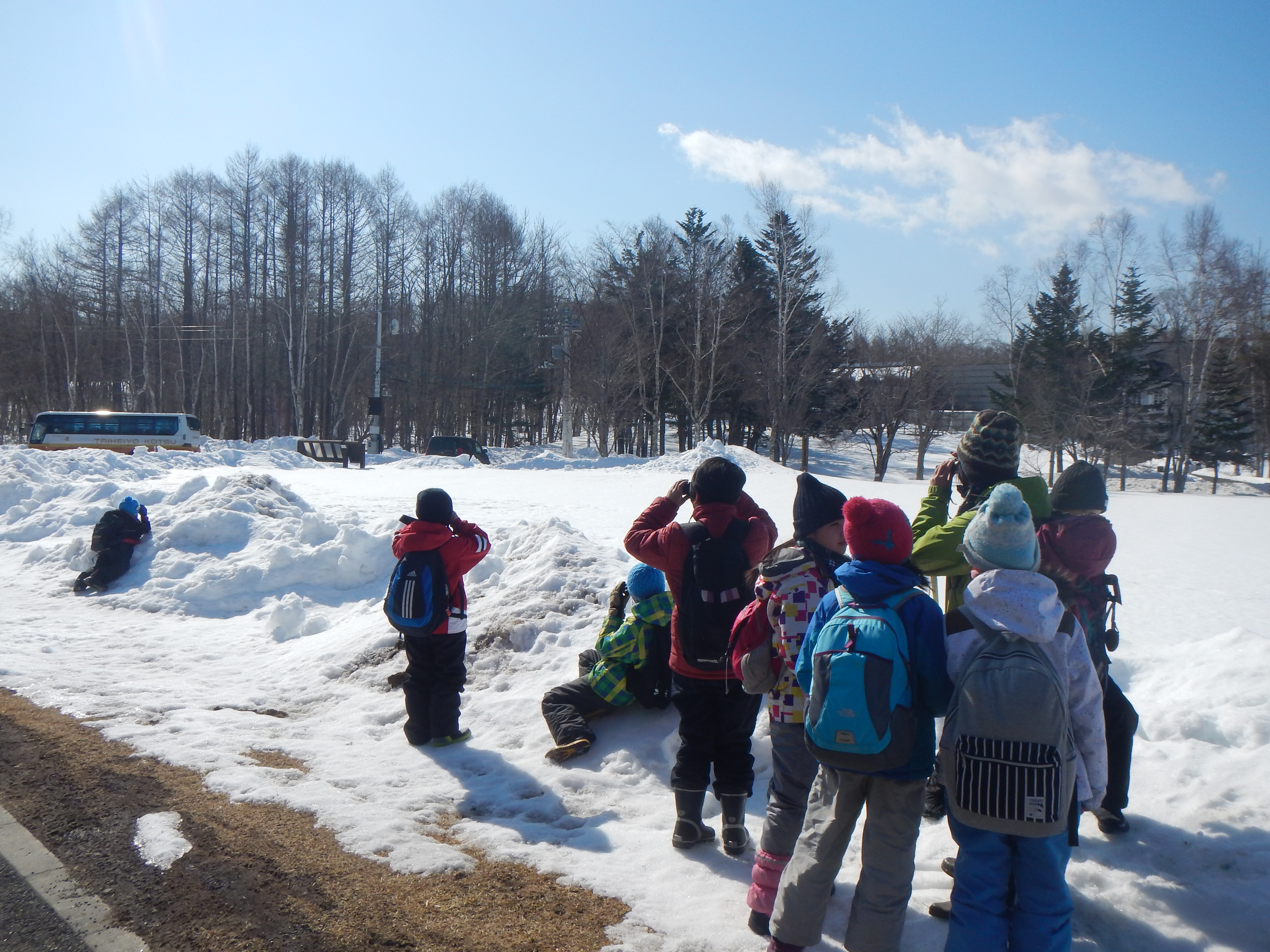 まずは、お見送りの保護者たちとお別れをして、塘路湖エコミュージアムセンターへ。子どもパークレンジャーの任命式をしたあと、双眼鏡の使い方を練習しました。