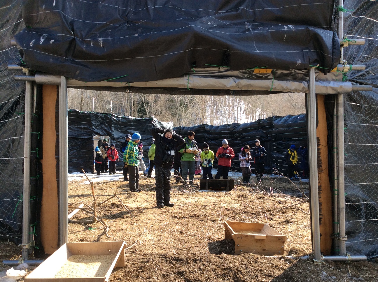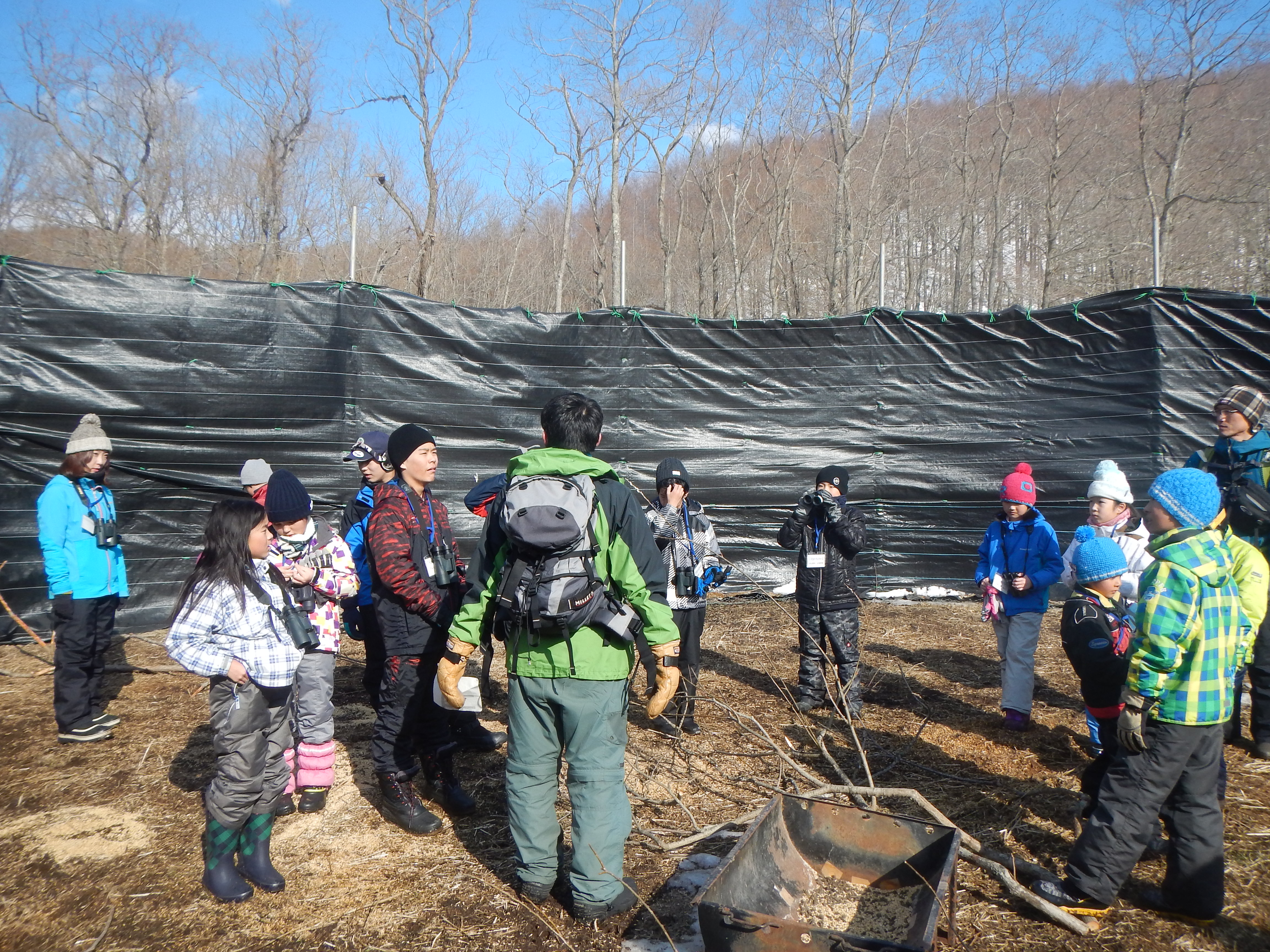 僕たちは、シカになったつもりでわなの中を見学。子どもたちから「捕獲したあとは、どうするの?」という質問に、反応を少し心配しながら「シカの命を無駄にしないよう食肉にします。」と正直に答えると、「給食で食べたことある!」と明るい返事が。さすが、シカ肉が身近な北海道の子どもたち!