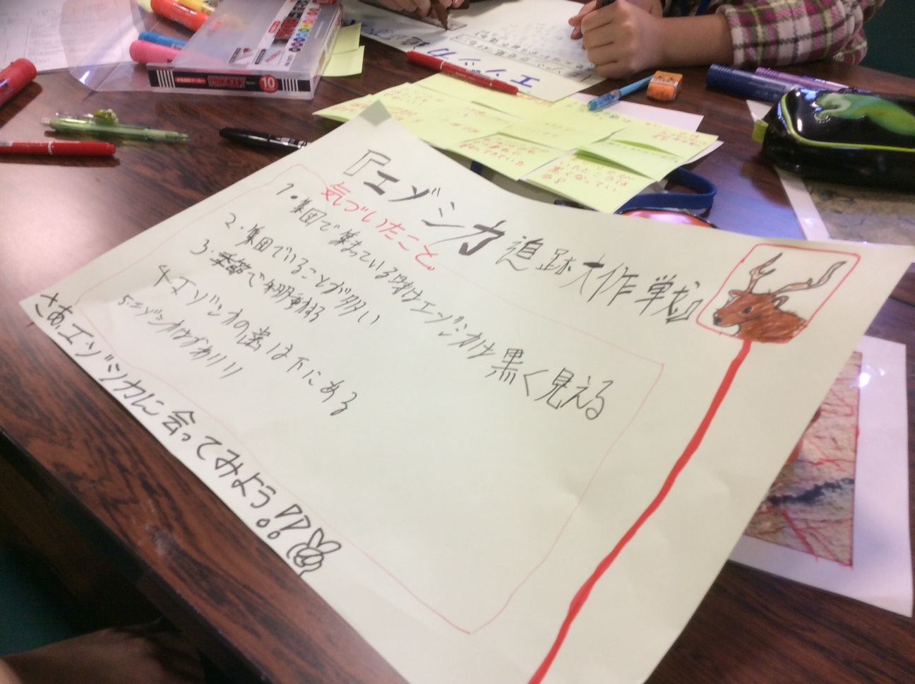 次に、「細岡展望台に来た観光客は、湿原の中にこんなにエゾシカがいるなんて知らないよね!」、「GPSをつけたシカがいることを伝えよう!」など、班ごとに相談しあいながら、まとめのポスターをつくります。いろんなアイデアを思いつく子、絵や飾り文字を描くのが得意な子、仕事を割り振るのが上手な子、それぞれの個性を活かしてつくりあげていました。