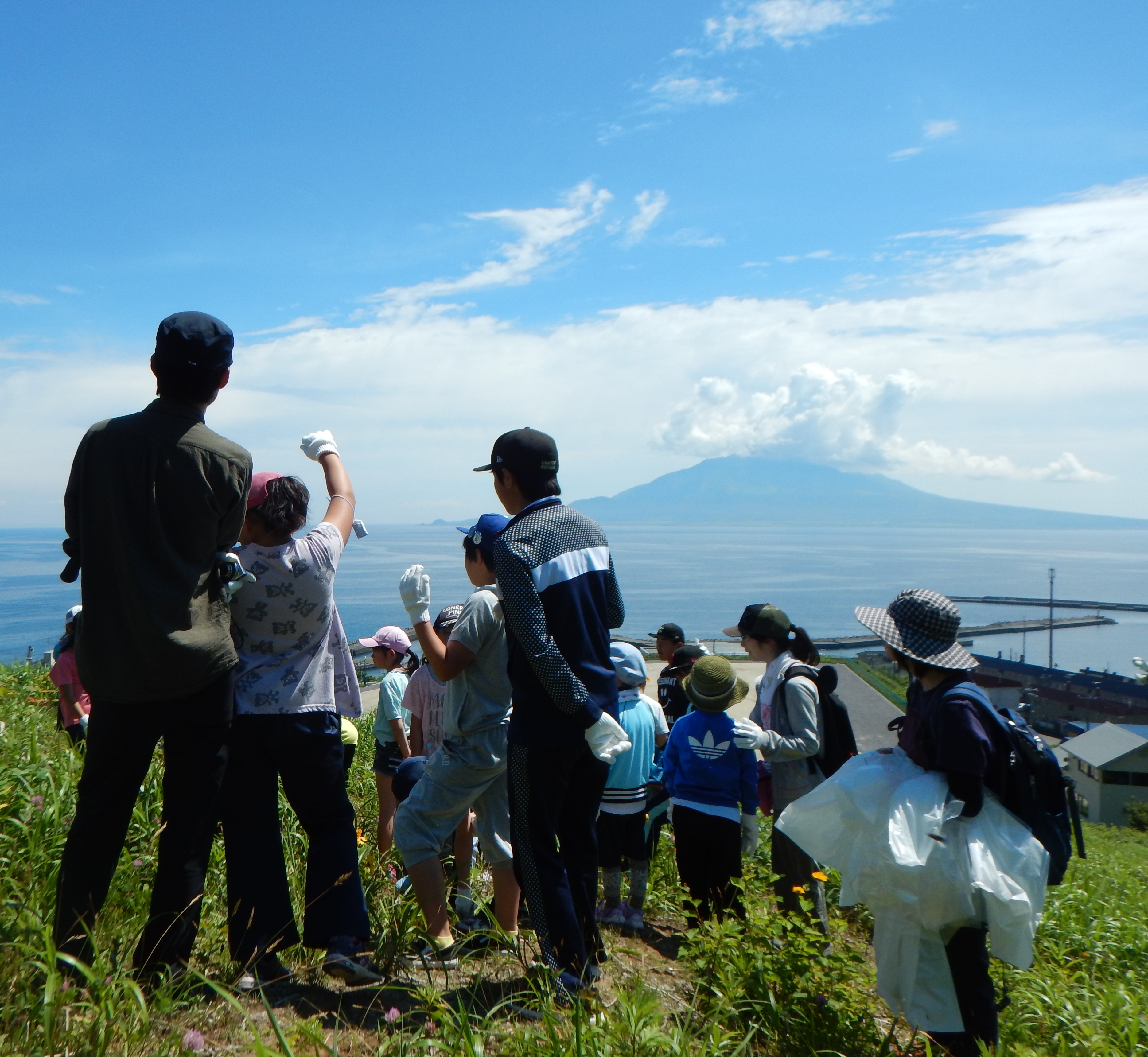 ※利尻を背景に楽しそうに活動中。引率の先生方も一緒に抜いてくれました。
