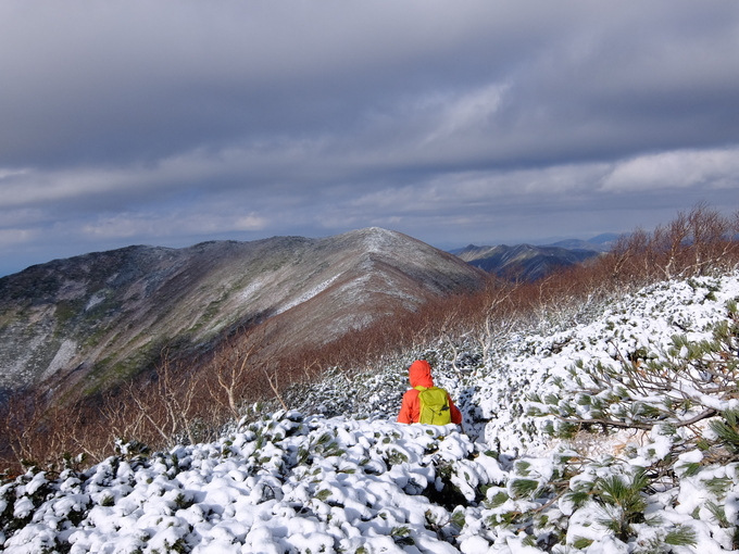 そして当日の朝をむかえましたが、なんと深夜に積もった雪で稜線は白く輝いているではありませんか。怪しいコンディションが予想されましたが、安全第一で登ってみることにします。しかし積雪量はわずかに10㎝ほど。少々足下がひんやりしますが、歩けばすぐに体は温まりました。そして雪の代わりに我々を苦しめるのは、日高山脈名物の藪漕ぎです。ねじ曲がった強力なハイマツに苦戦しつつ、予定より少し遅れて豊似岳山頂に到着。苦労した分、前日とは違った絶景を堪能できました。