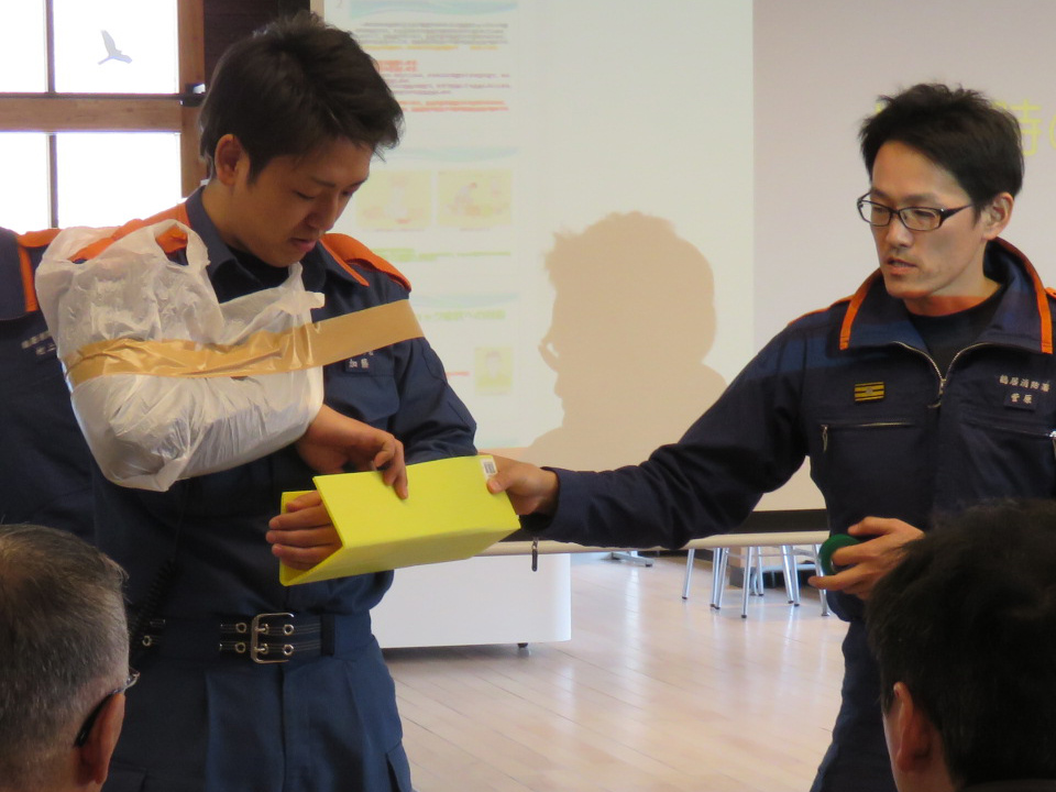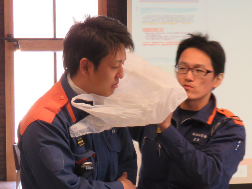 骨折した腕を固定することができました!ビニール袋は、止血で直接圧迫する際の感染症予防にも使えるので、リュックに大小1枚ずつ入れておきたい便利グッズとのことでした。ガムテープかビニールテープもあると、なお良し!