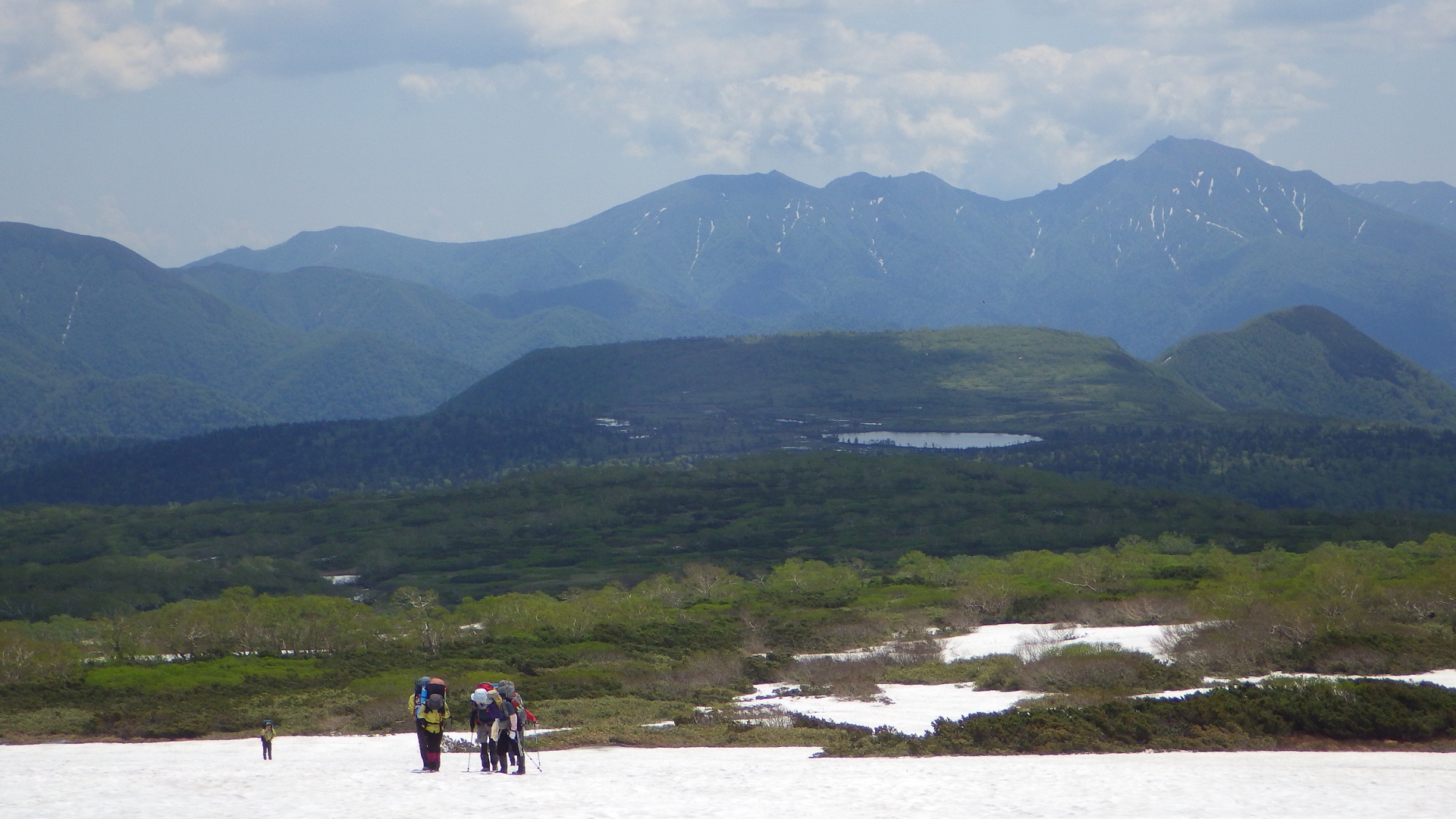 初夏、まだ残雪が多く残る頃、パークボランティアのみなさんと沼ノ原クチャンベツ登山口から入山し、ヒサゴ沼野営指定地に泊まってトムラウシ山まで登山道整備に赴いたときの風景です。五色岳山頂を間近にして、来た道を振り返ると、大沼を抱えた沼ノ原越しにニペソツ山を望むことができます。