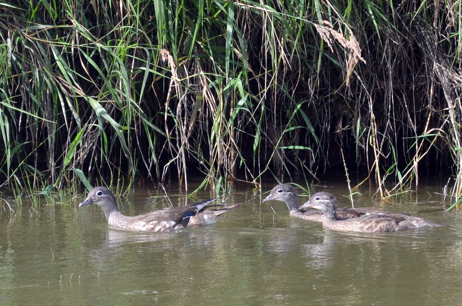 10:15 アレキナイ川にかかる鉄橋を3本くぐると水鳥たちがお出迎え。左のカルガモはうたた寝。右のオシドリは、育児をお母さんに任せてお父さんはどこかへ(これが「おしどり夫婦」本来の姿...)。