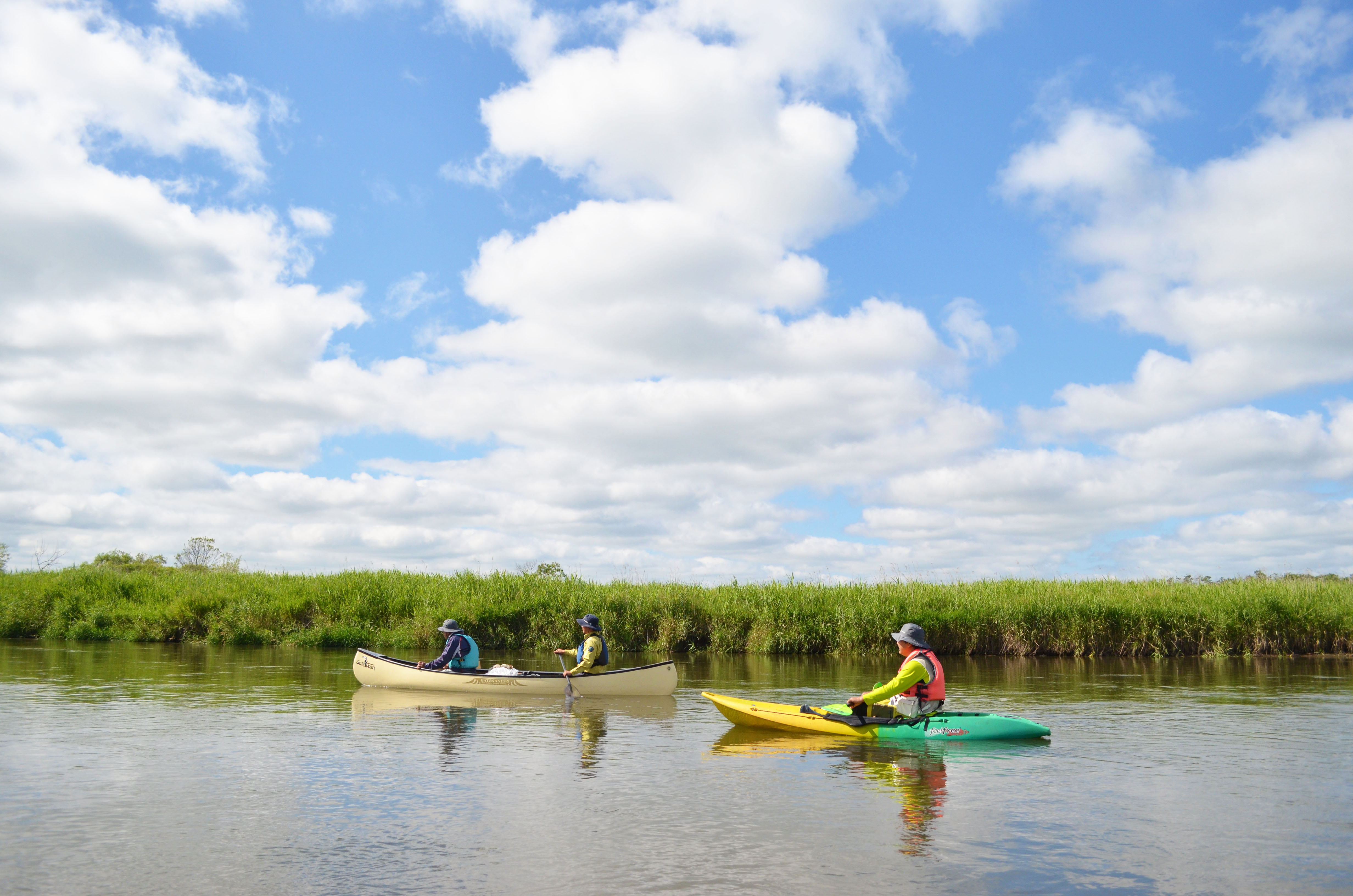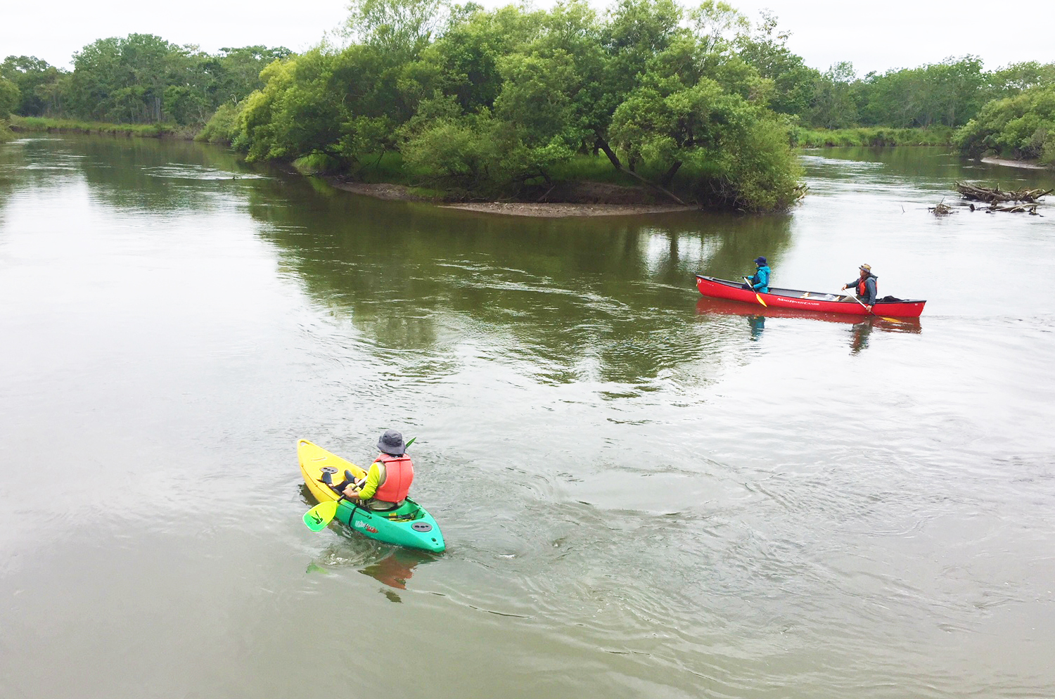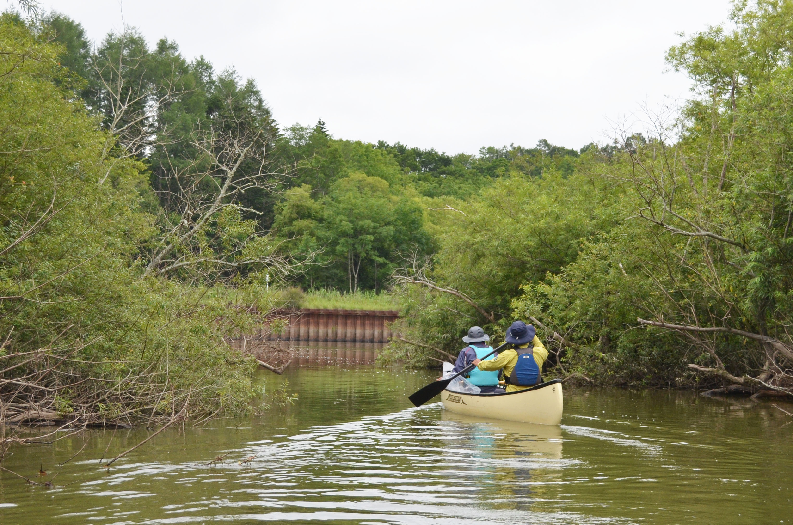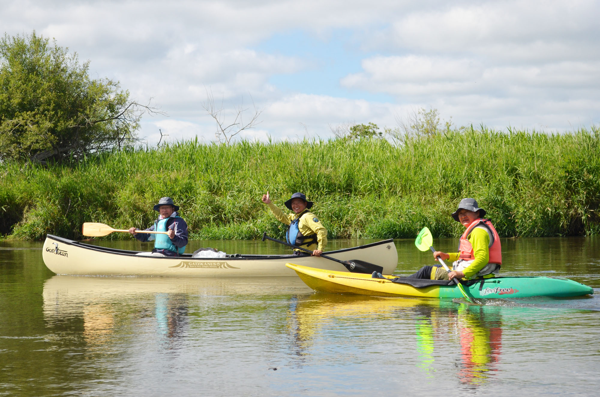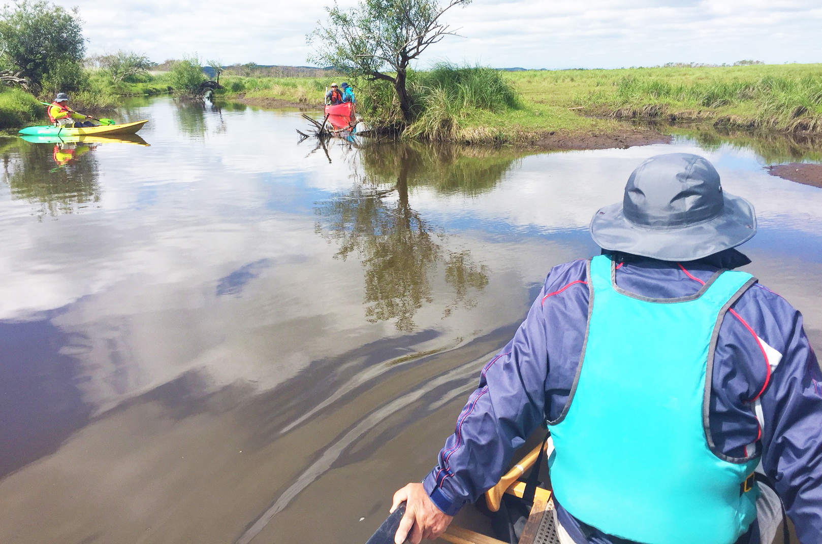 10:00 1日目のゴール地点だった塘路湖キャンプ場を出発し、まずは昨日遡ってきたアレキナイ川を目指します。アイヌ語でアレキナイとは「来る川」、昔から船や人が往来する交通の要所だったそうです。