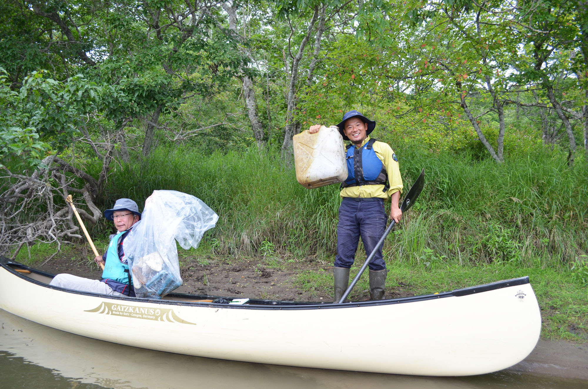 もちろん今日も川の清掃をしながら。「3時方向に発見!下流から近付いて!」、「前漕ぎ!アップ!アップ!」と前後で息を合わせながらゴミ回収。上流からお客さんを乗せて下ってきたカヌーガイドさんに、「綺麗にしてくれてありがとう。でもゴミ拾いなのに楽しそうなのはなぜ?」と声をかけられましたね(笑)。