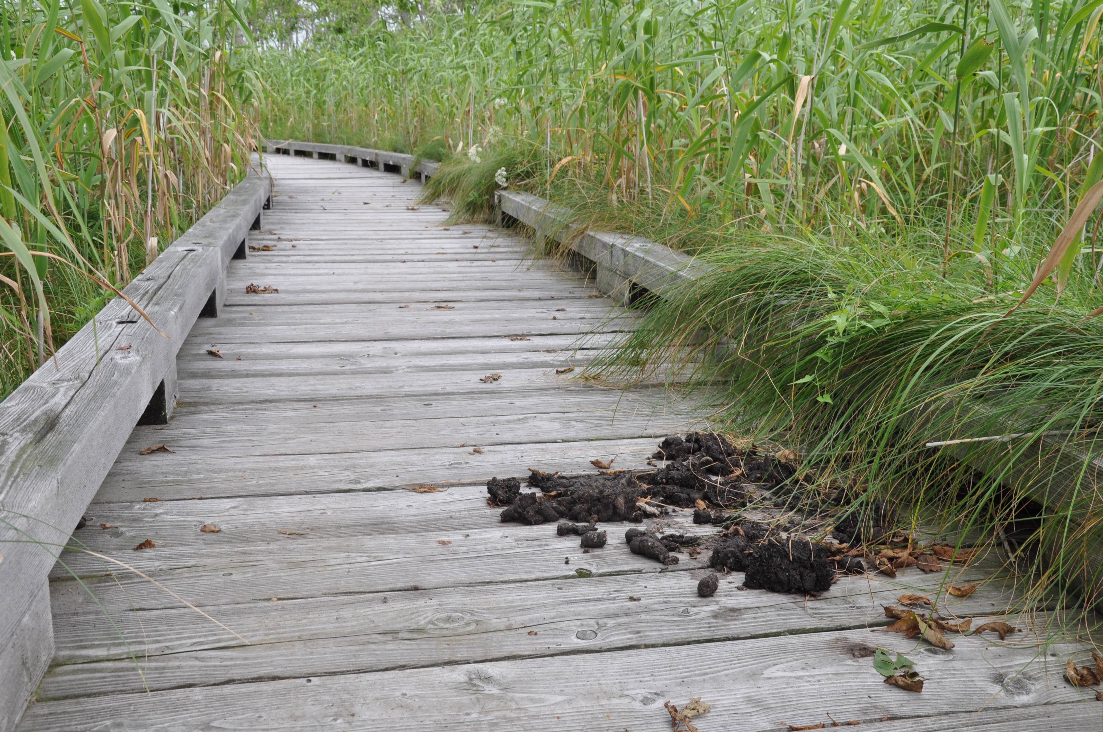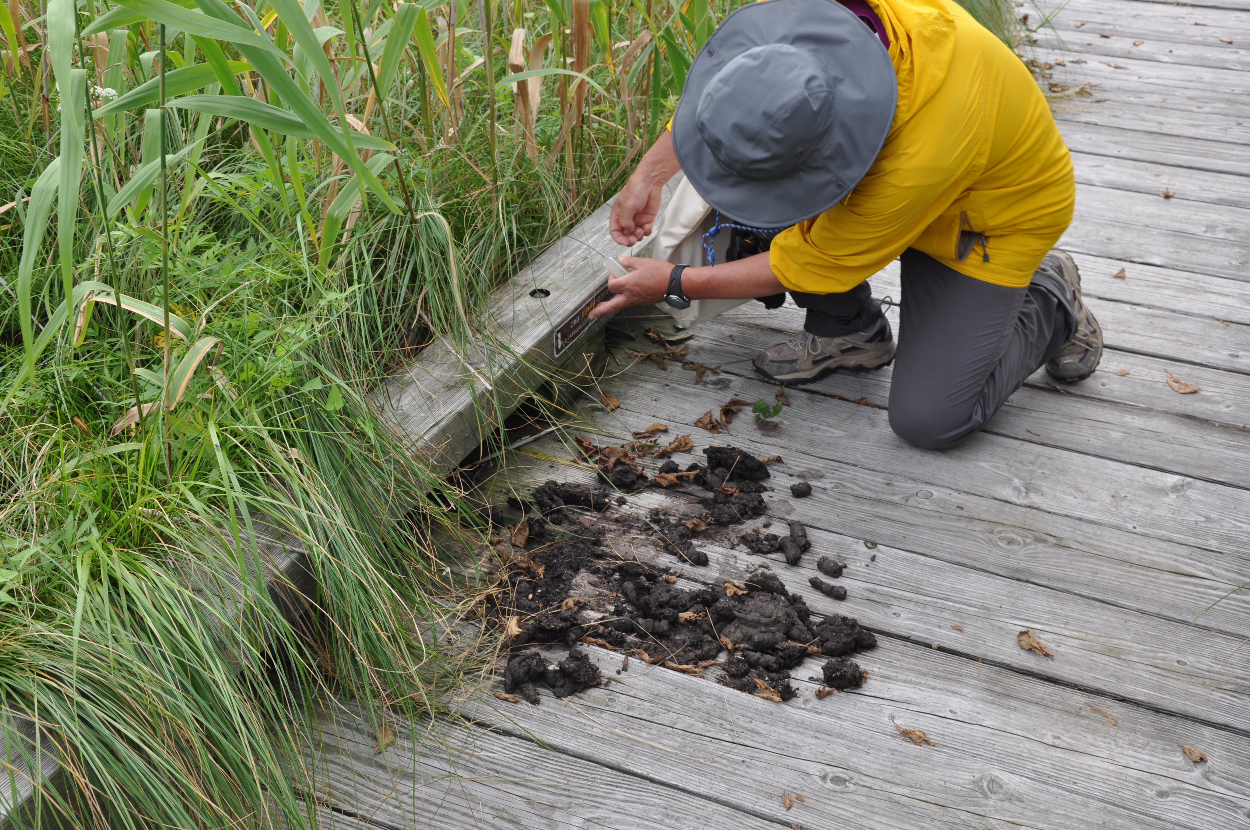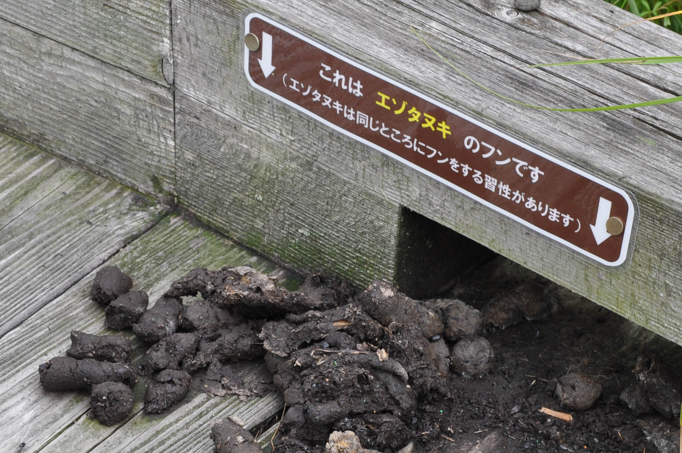 いない訳ではないけれど、ずっとビクビクしながら歩くのも楽しくないだろうと思い、すぐ温根内ビジターセンターで看板をつくってもらい、パークボランティアの小川さんと手分けをして貼りに行きました。特大サイズの糞が計6箇所も。