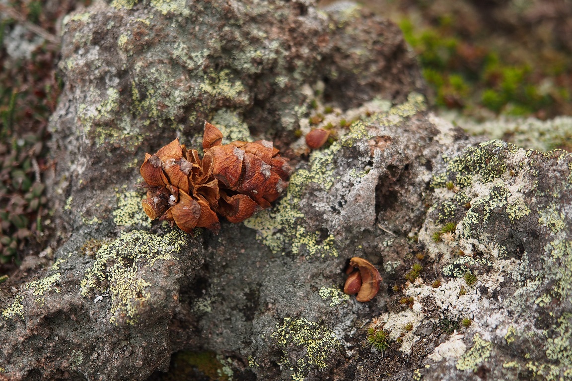 岩の上に転がっていた誰かの落とし物。彩りの季節、その背後にまだ遠くにありながらも存在感を示すシロい季節を私たち以上に感じ取っている生きものたち。必死に生き残るための準備をしているのでしょう。