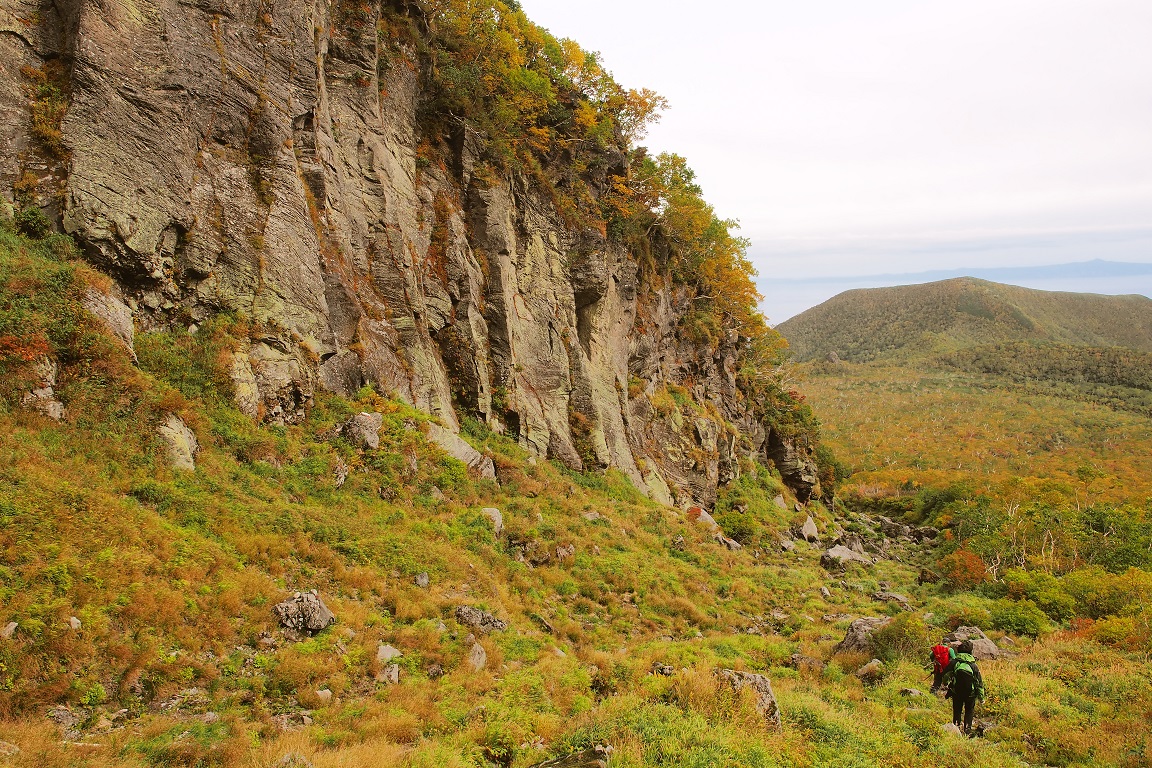 羅臼温泉登山道ビュースポットの一つ屏風岩も秋色に染まっておりました。こちらは後1週間ほどでピークを迎えるでしょうか。天気の良い日、紅葉に包まれた屏風岩を青い海に浮かぶ国後島をバックに見る景色は圧巻です。