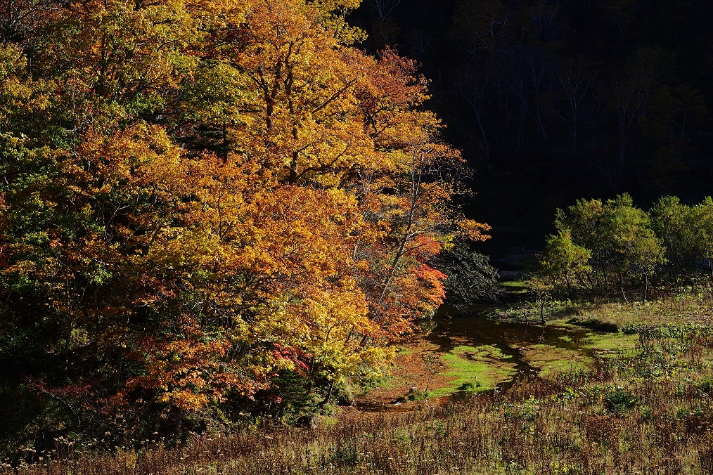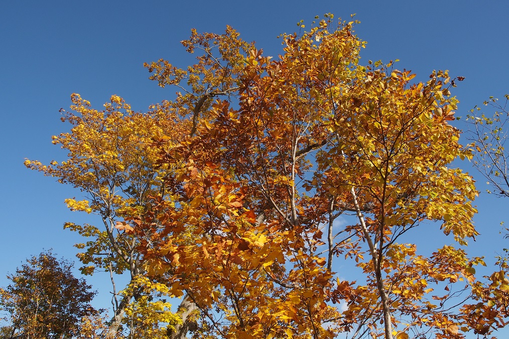 知床の紅葉の印象は黄色。オガラバナやエゾイタヤ、ダケカンバにミズナラと葉が黄色く染まるものが多く生育しているためと思われます。