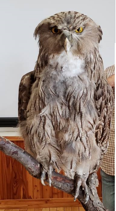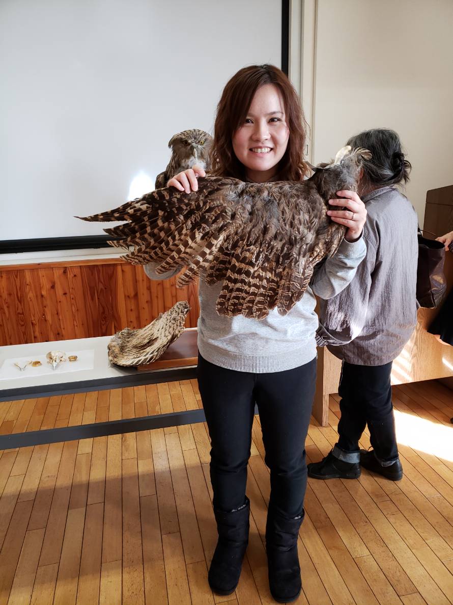 皆さんの真剣な眼差しや、剥製を触ったときの驚きの表情、次から次に飛び出す質問の嵐に皆さんの関心の高さが伺えました。剥製も大好評で、休憩時間やセミナー終了後にも部分標本の羽を手に取ったり、ツーショットで記念撮影をしたりされていました。写真で見るよりも大きな体と、寒い地域に適応した形態などシマフクロウの特徴を知っていただくことが出来たようです。剥製となっている子は、残念ながら事故で死亡した個体を活用しています。イベント後はヘアスタイルがボサボサになってしまうのですが、毛繕いをして指にクリームを塗り、美容にはしっかりと気を遣っていますよ。(笑)