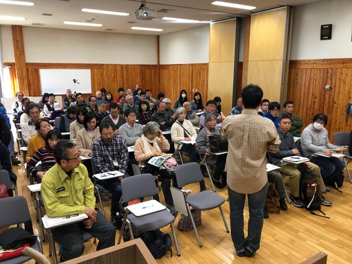冒頭は当所の太田課長補佐が「シマフクロウ保護増殖事業の歩み」と題して、1990年には100羽以下まで生息数が減ったシマフクロウを、研究者の方々や行政が絶滅を危惧し開始した、保護活動の歴史についてお話しました。続いて、シマフクロウ環境研究会代表の竹中氏に、シマフクロウの棲む森で今何が起きているのかについて、データに基づいた科学的なお話をしていただきました。