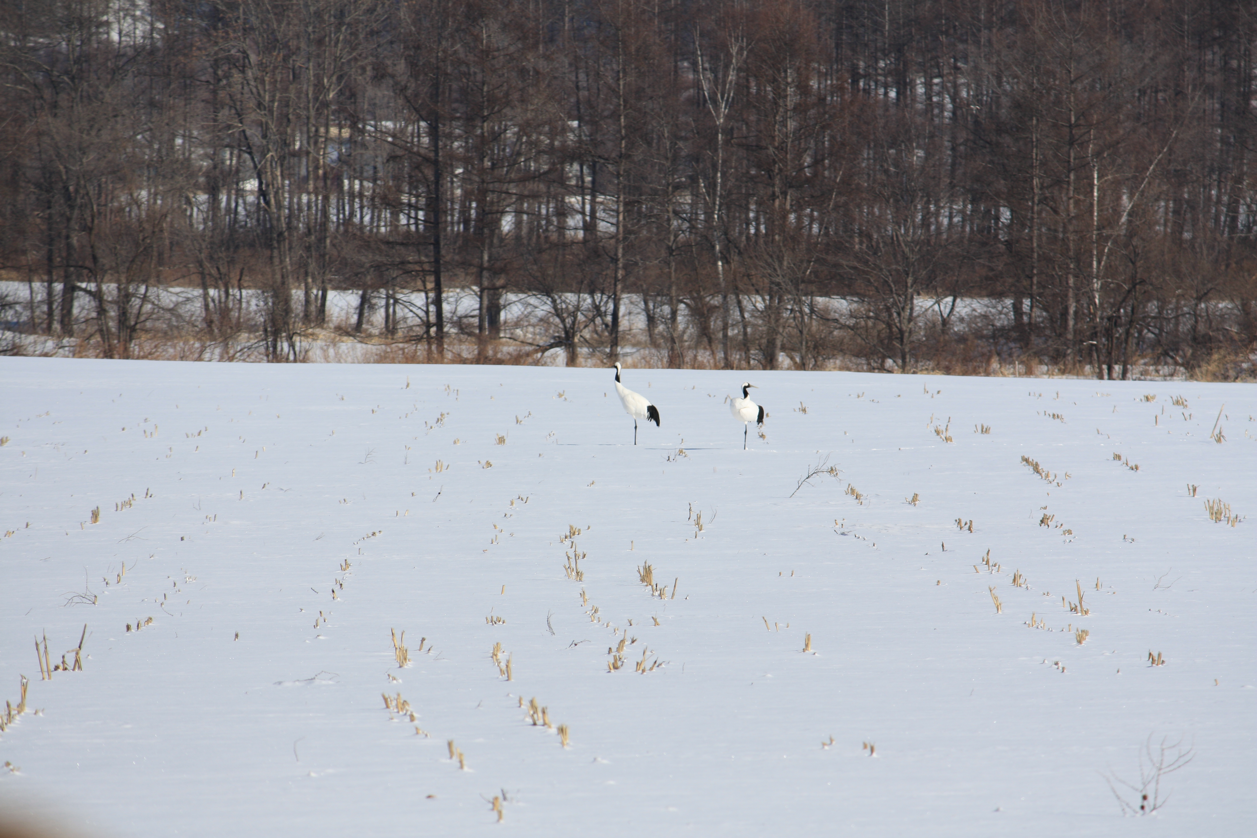 本グループの丹念な調査によって、最近になって、ひとつの細い支流が凍らずにタンチョウの餌場となっていることが分かりました。この日もとある場所で二家族、7羽を確認しました。地域の周辺をくまなく巡り、別の場所に飛来していた4羽を見つけましたが、元の場所へ戻ってみると二家族の姿がありません。二家族のうち一家族が移動していたのでしょう。このようにきめ細かく観察しカウントの重複を除きながら調査しました。