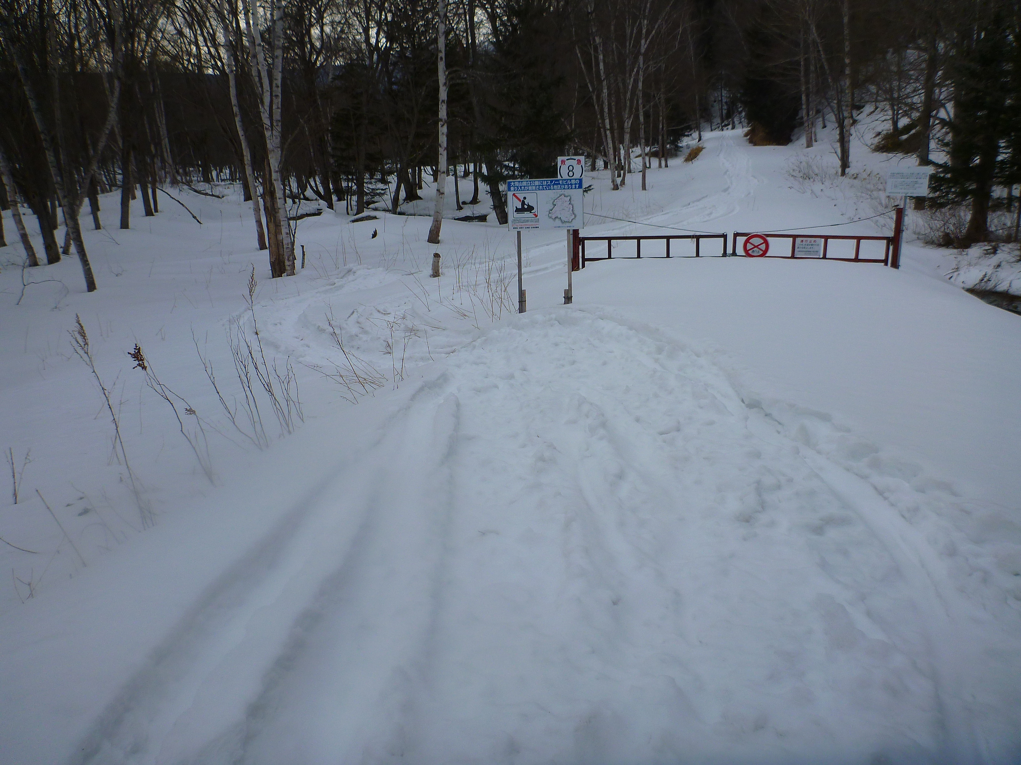 自然保護官事務所では、乗入れ規制地区への入口となる場所に看板を立て、乗り入れ規制を周知しています。また、これらの地区を随時、巡視しています。この日、十勝三股の森、奥深くに通じる林道の入口まで来ると、スノーモビル乗り入れの痕跡がありました。この場所は昔、山奥に野湯が湧いていて密かに人気であったらしいのですが、2016年の大雨被害で、道路は寸断、湯殿も流れ去っています。