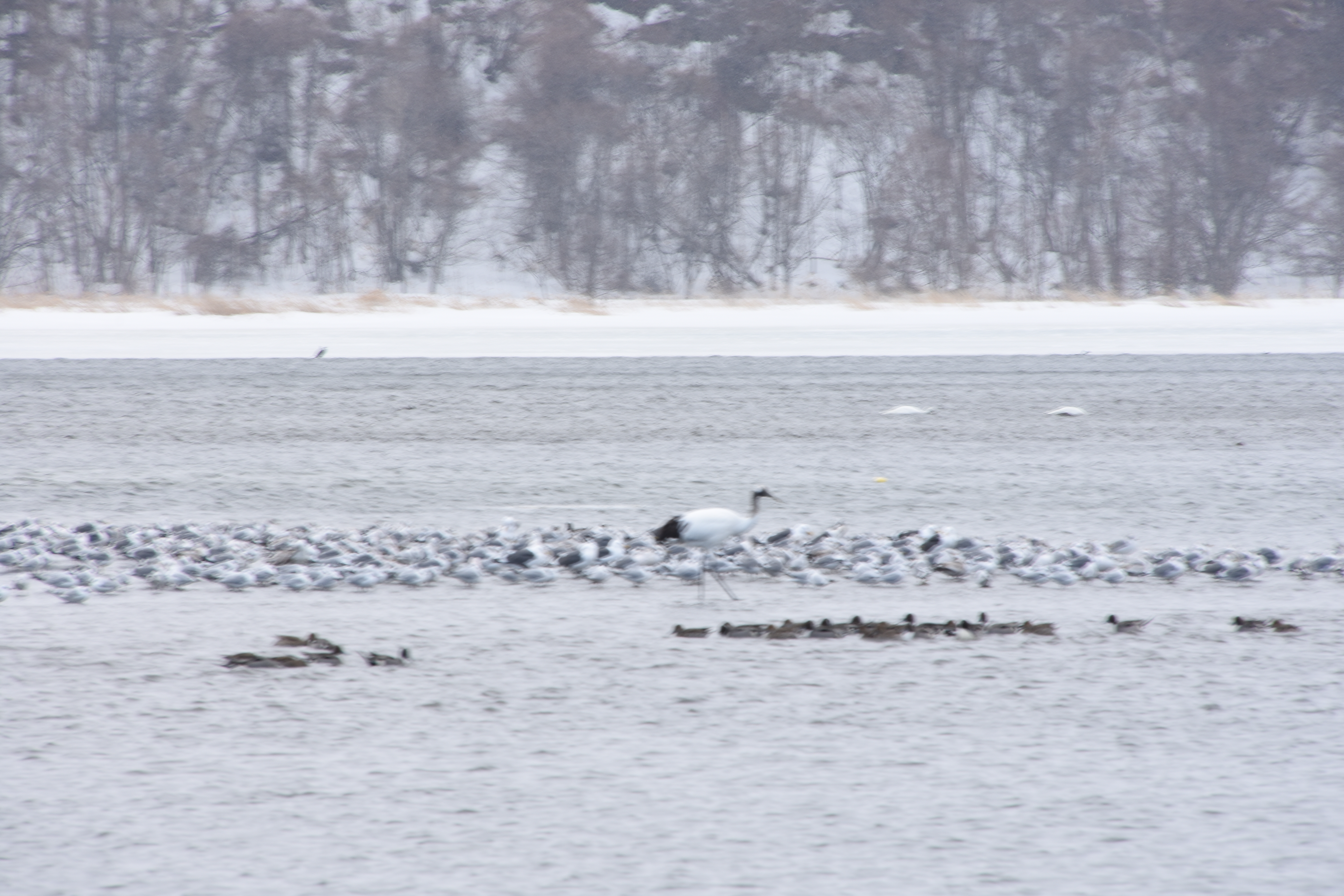 濤沸湖水鳥・湿地センター 環境省の直轄施設。センター内から多種多様な鳥類が観察できます。カモの群れの中に若いタンチョウが。