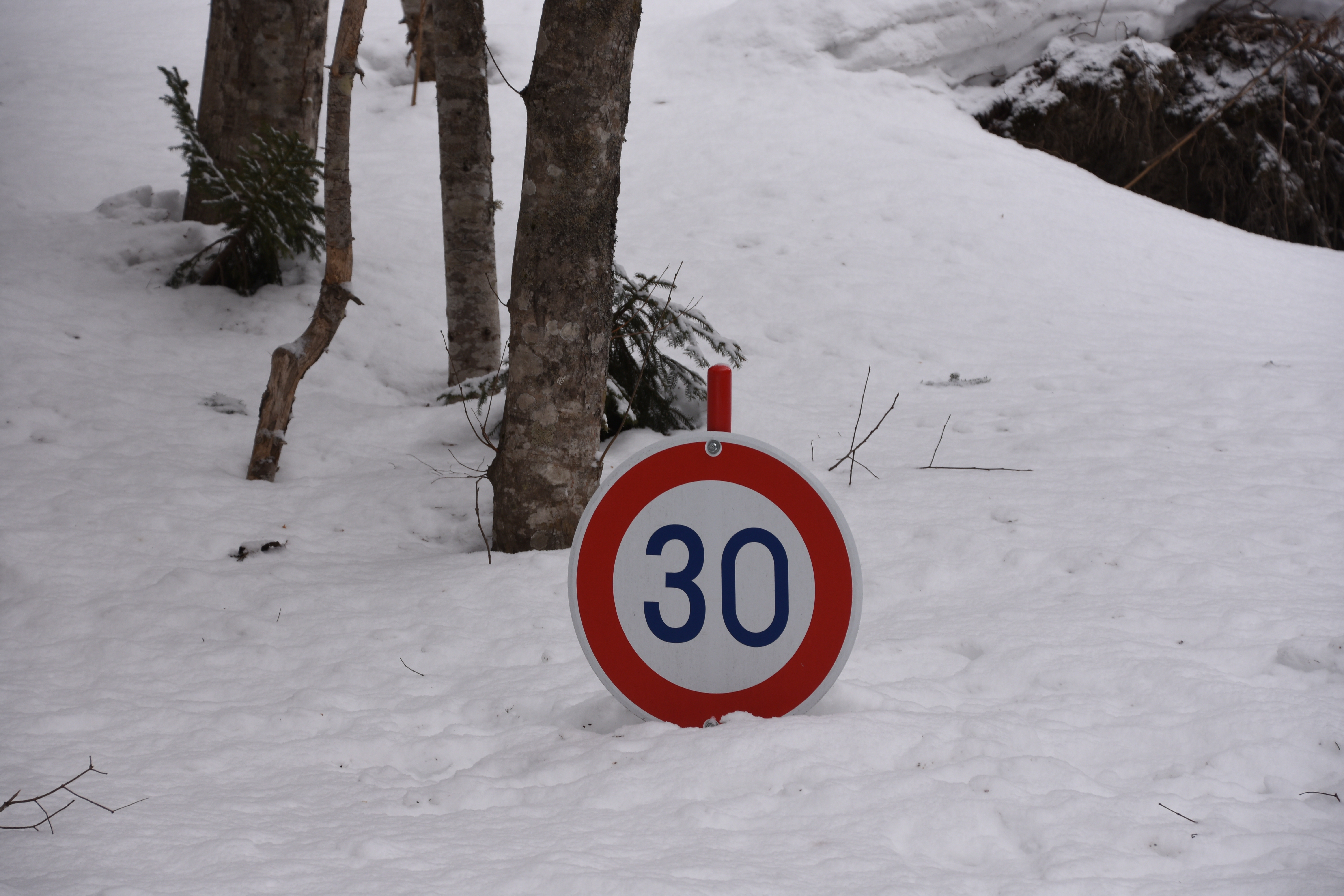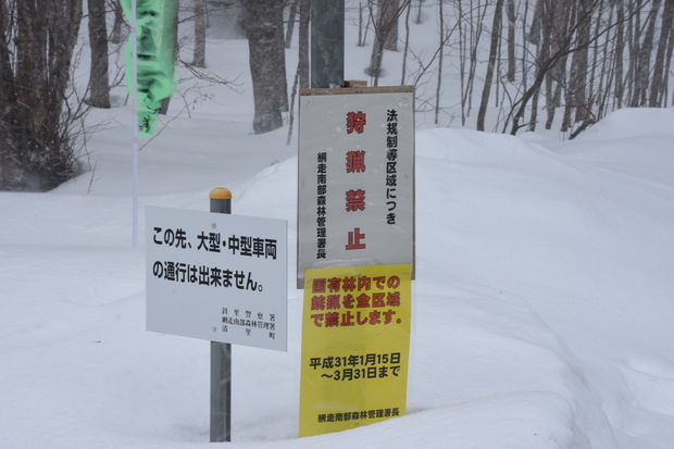 道路脇の標識はこのとおり。林道の真ん中にある先行者のトレール跡を外さなければスノーシュー等は必要ありませんでしたが、持参が無難。