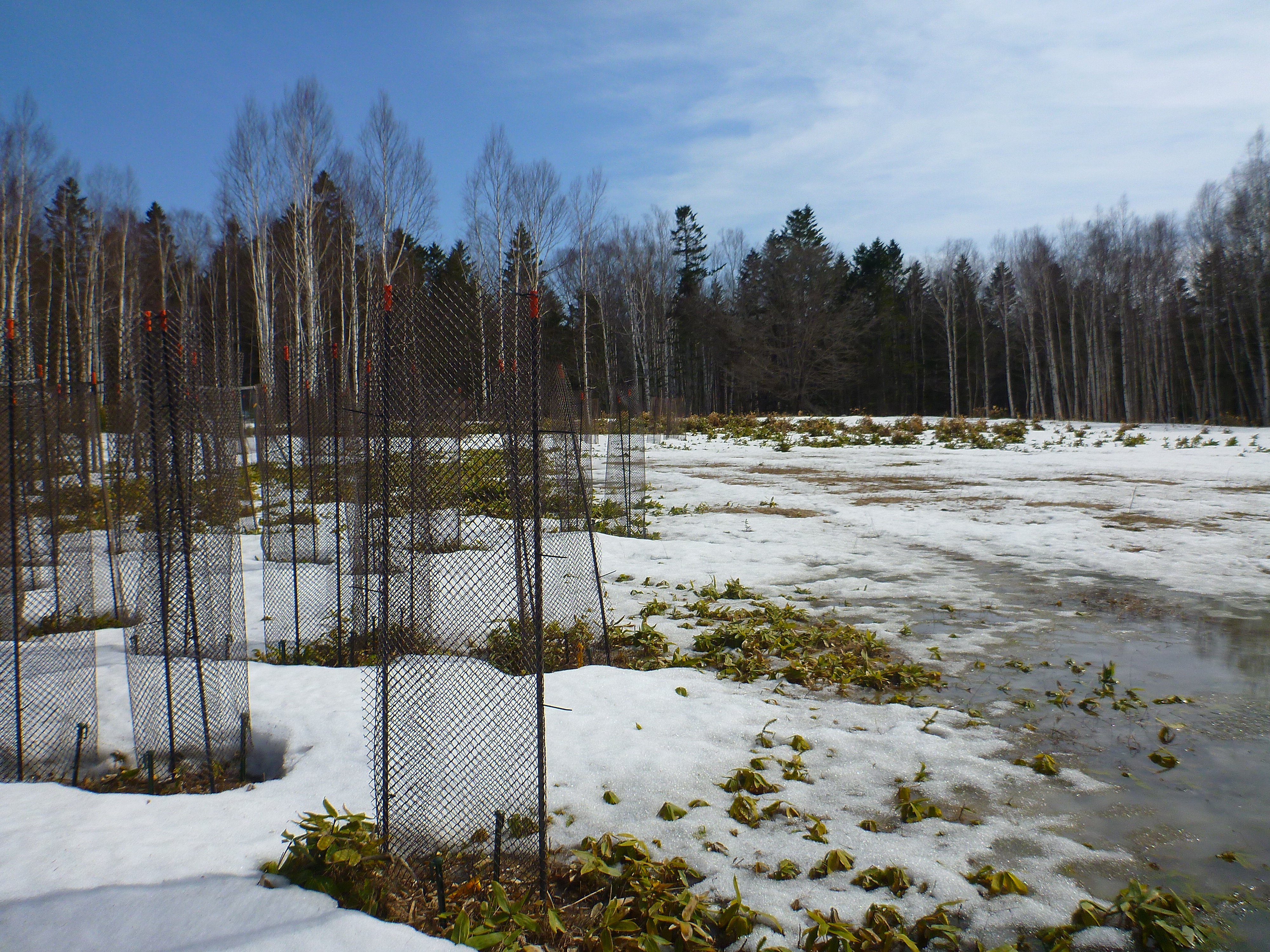 その三股で、環境省は跡地を森に帰そうと植生復元活動を続けています。ひがし大雪自然館と共催で植樹イベントを開き、鹿の食害を防ぐため、柵で四角く囲んだり、網で丸く囲んだりしながら植樹を増やしてきました。大雪山国立公園パークボランティアのみなさんの力を借りながら手入れもしています。