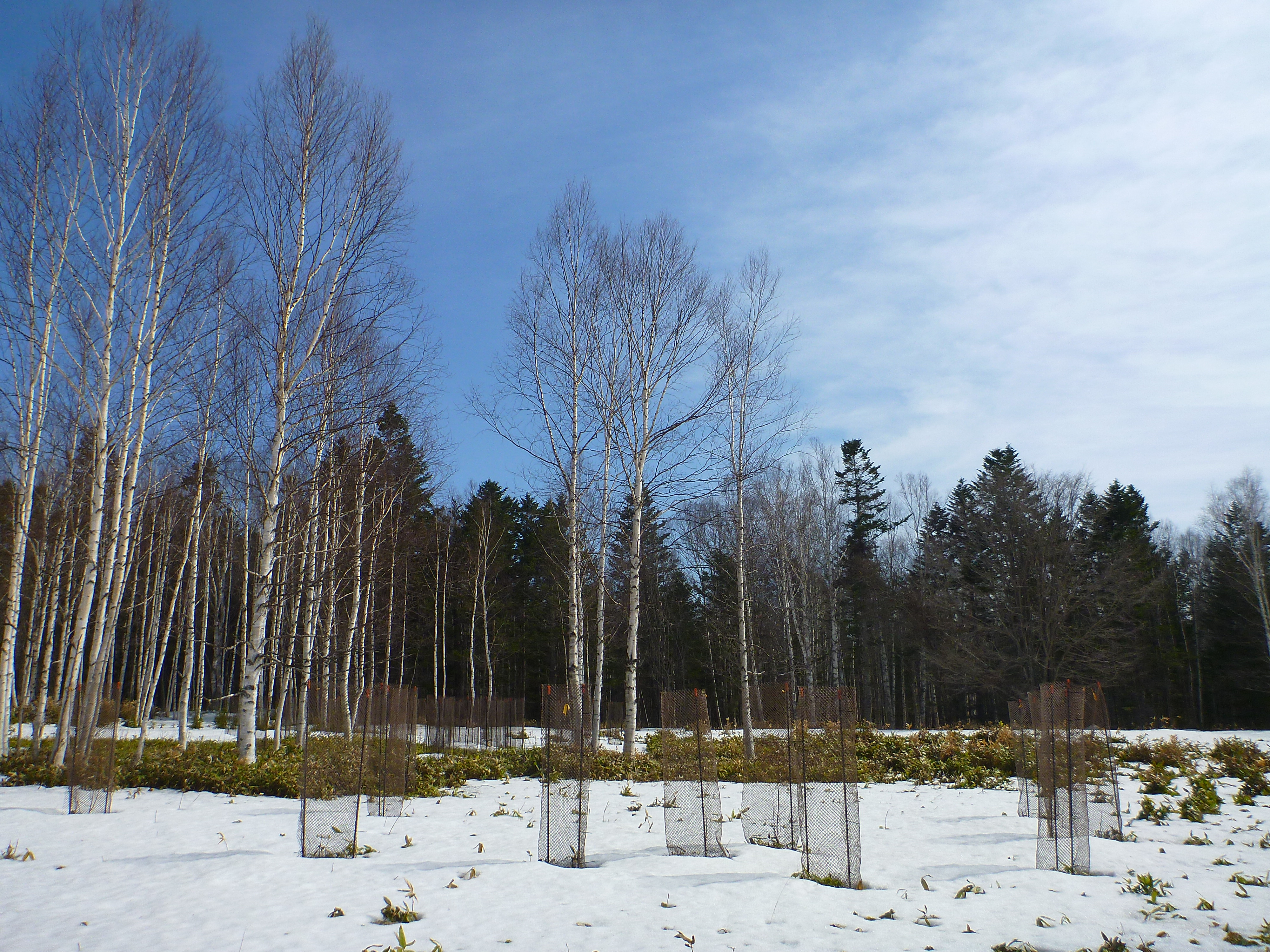 数年前から、一本一本の木を支柱と網で囲む対策に変わりました。初めは、支柱の数を節約したり、固定の方法を試行錯誤したりしたものの、雪の重さに堪えられず変形してしまいました。今では、囲む網の径や支柱の数、そのほか設置のコツをつかみ安定するようになりました。植える木は、周辺の道路脇などから、放っておけば安全管理などのため刈り払われてしまう稚樹を掘り取っています。