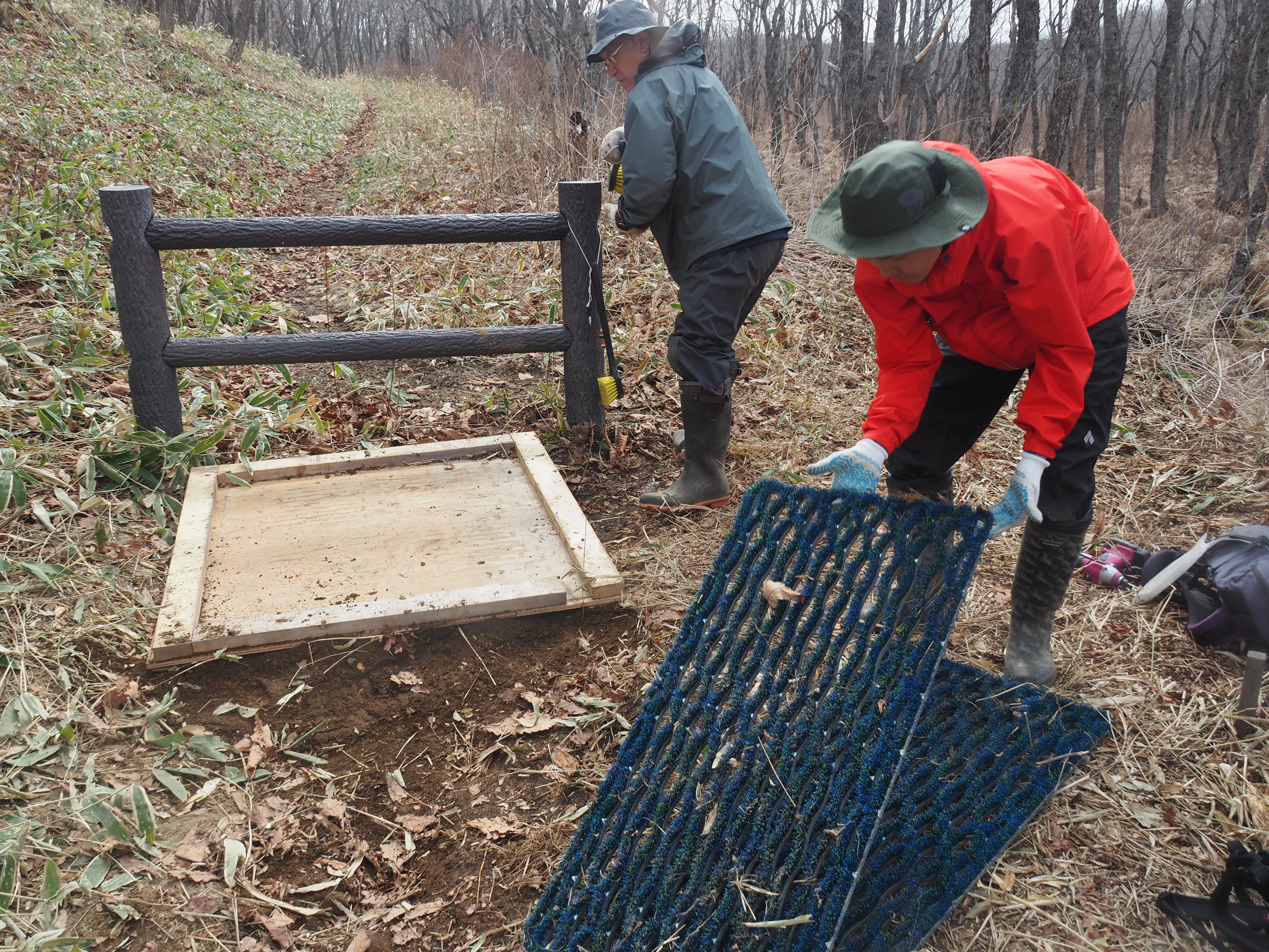 別日には、こちらもパークボランティアの方々にご協力いただき、キラコタン岬の入り口に外来植物の種子除去マットを設置しました。ここから先は、国立公園の特別地域、そして国の天然記念物のエリア。良い環境、良い景色を守っていきたいです。