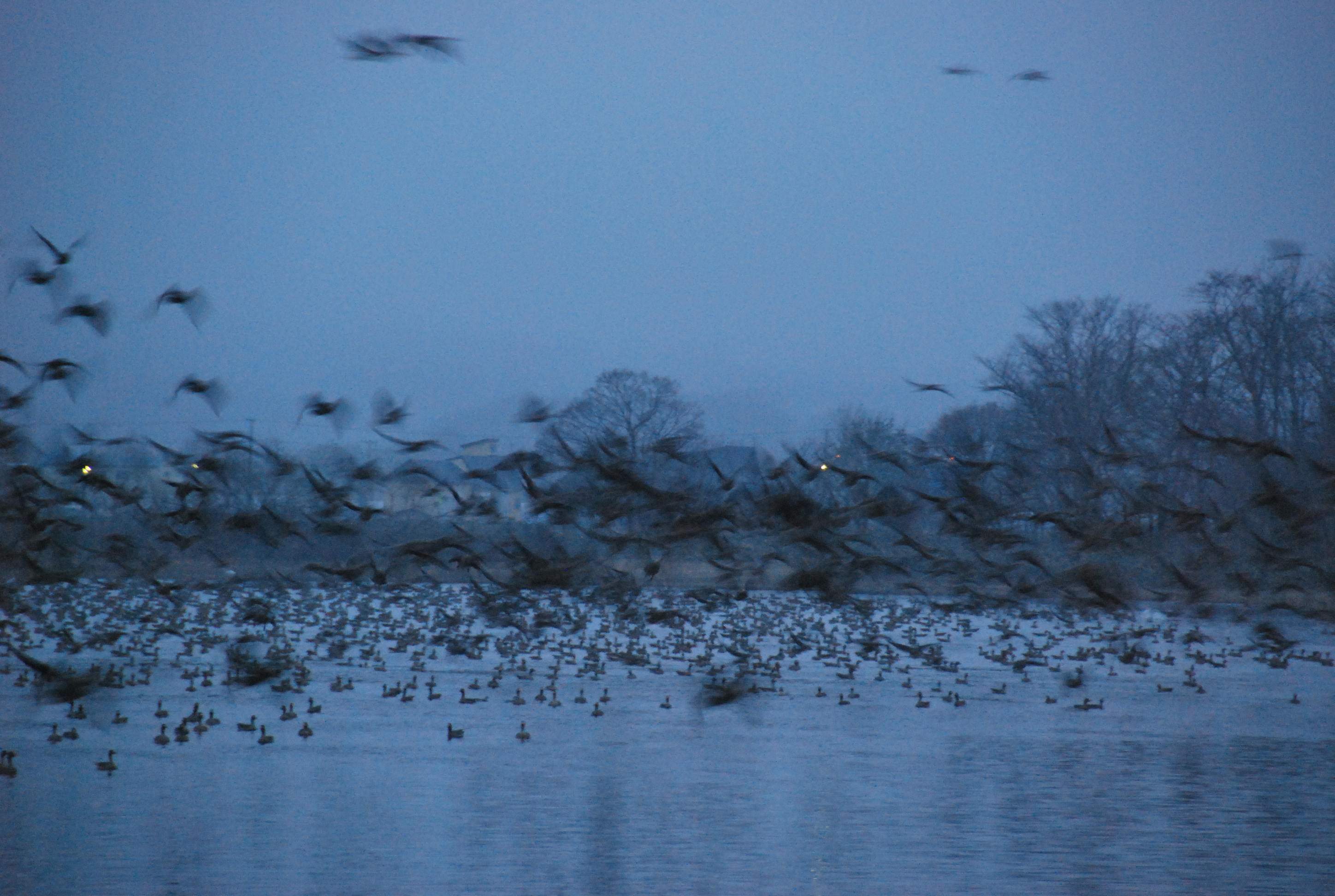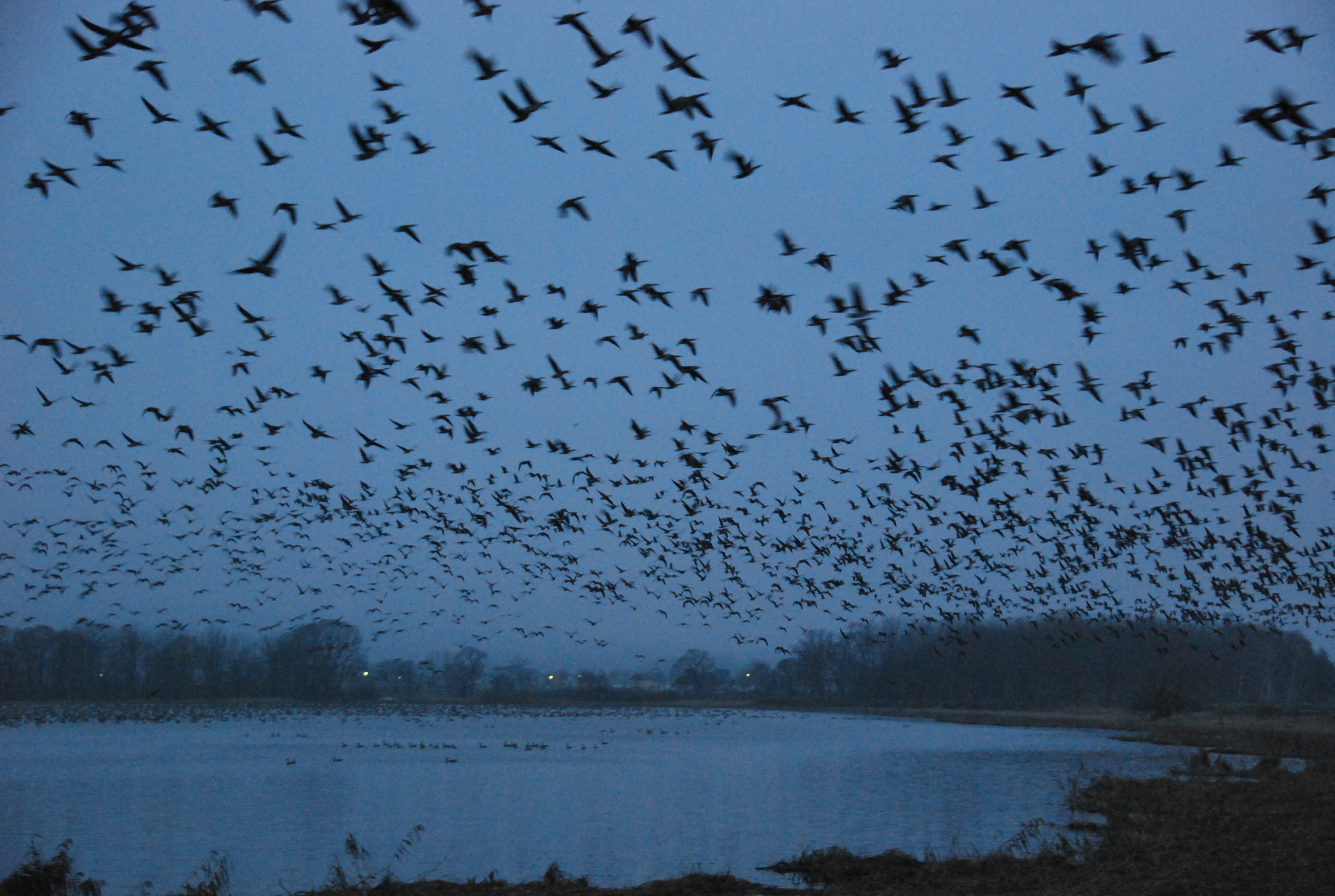 寒さに耐えながら、白い息を吐き、観察小屋の横に立っている私の耳に、突然、走っているはずのない貨物列車の音が沼の奥から地響きのように届きました。次の瞬間、黒い塊が沼の奥からこちらに迫ってきたかと思うと、一瞬で空を埋め尽くし、薄曇りだったわずかな空の光を遮り、再び暗闇が訪れました。