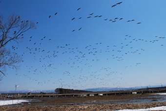 沼では、早朝に塒立ち(ねぐらだち)と言って、周辺の田畑へエサを食べるため、日の出ご頃に一斉に飛び立つ光景が見られます。