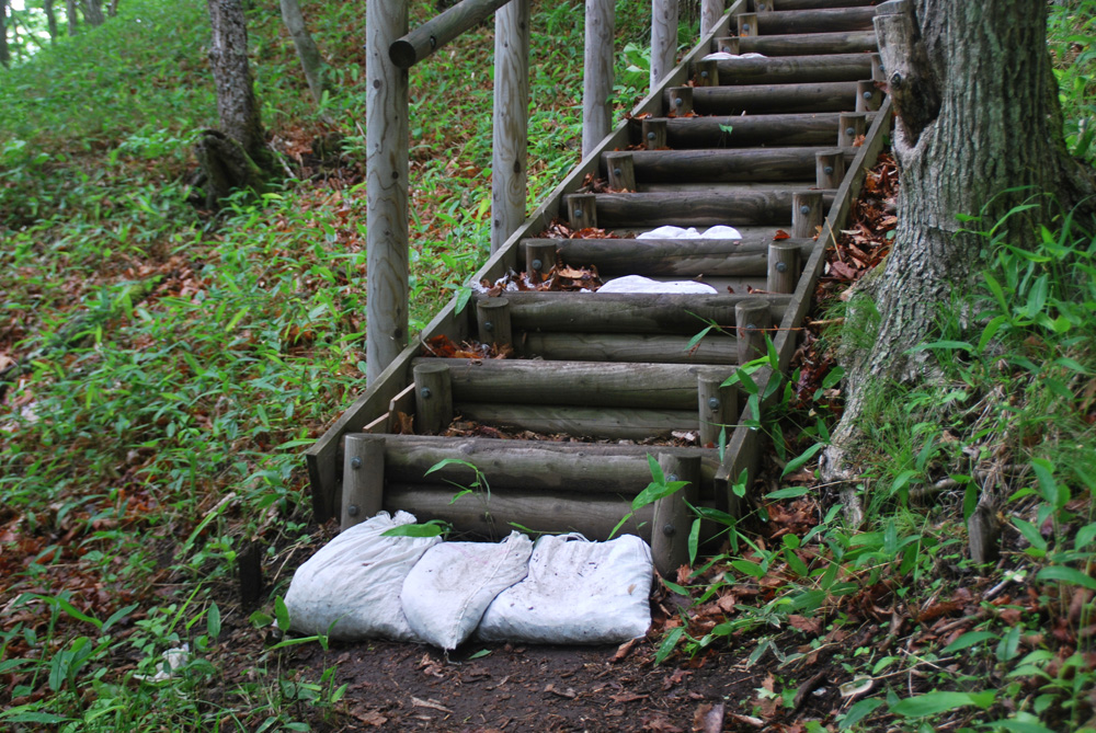 さて、夢ヶ丘達古武歩道は、いつ来てもやっぱりキレイ。一方、歩道の終点にある長い階段は痩せ気味・・・。ということで土のう袋に入れたウッドチップを運び、階段に補給する活動をメインでおこないました。