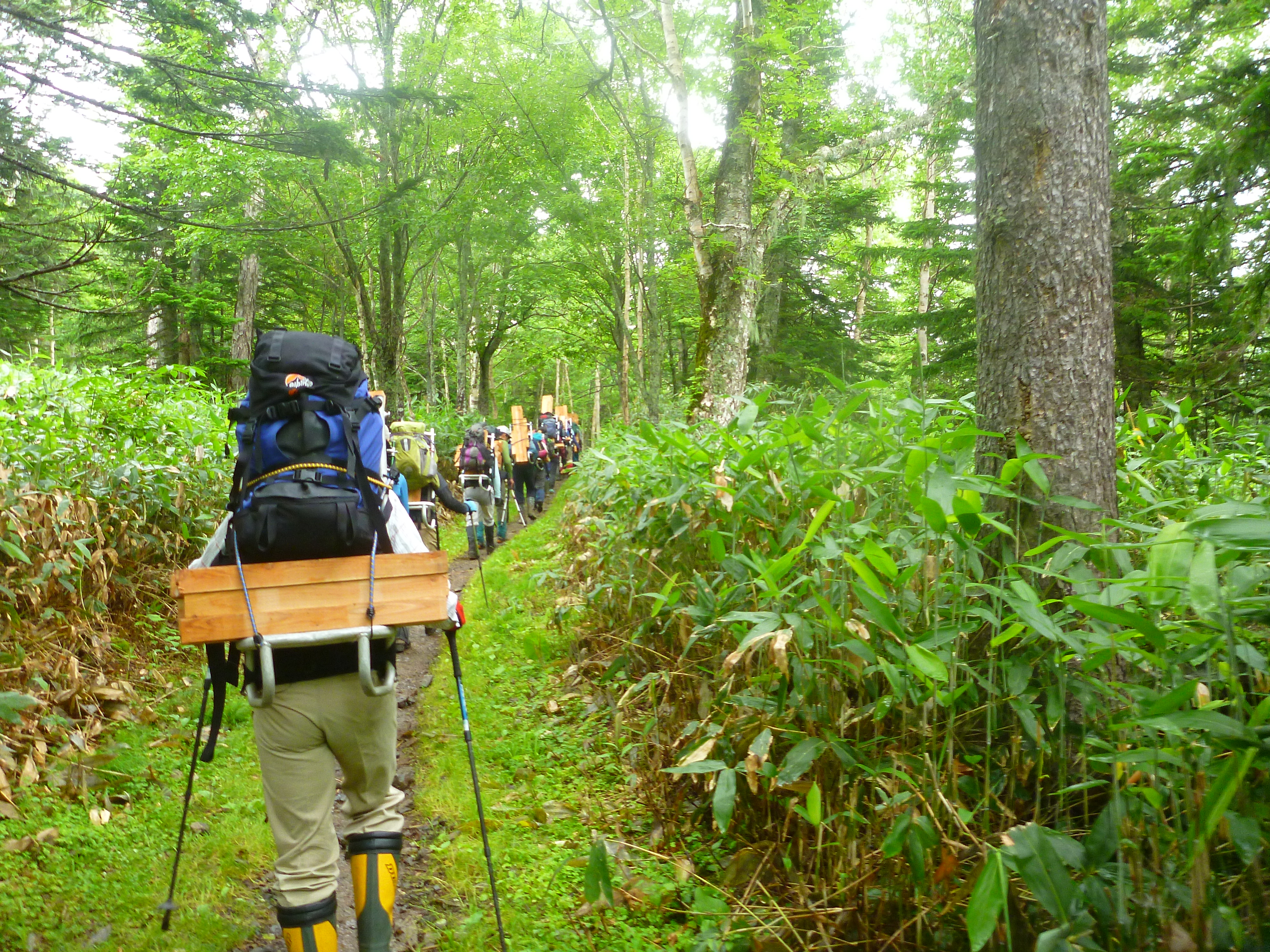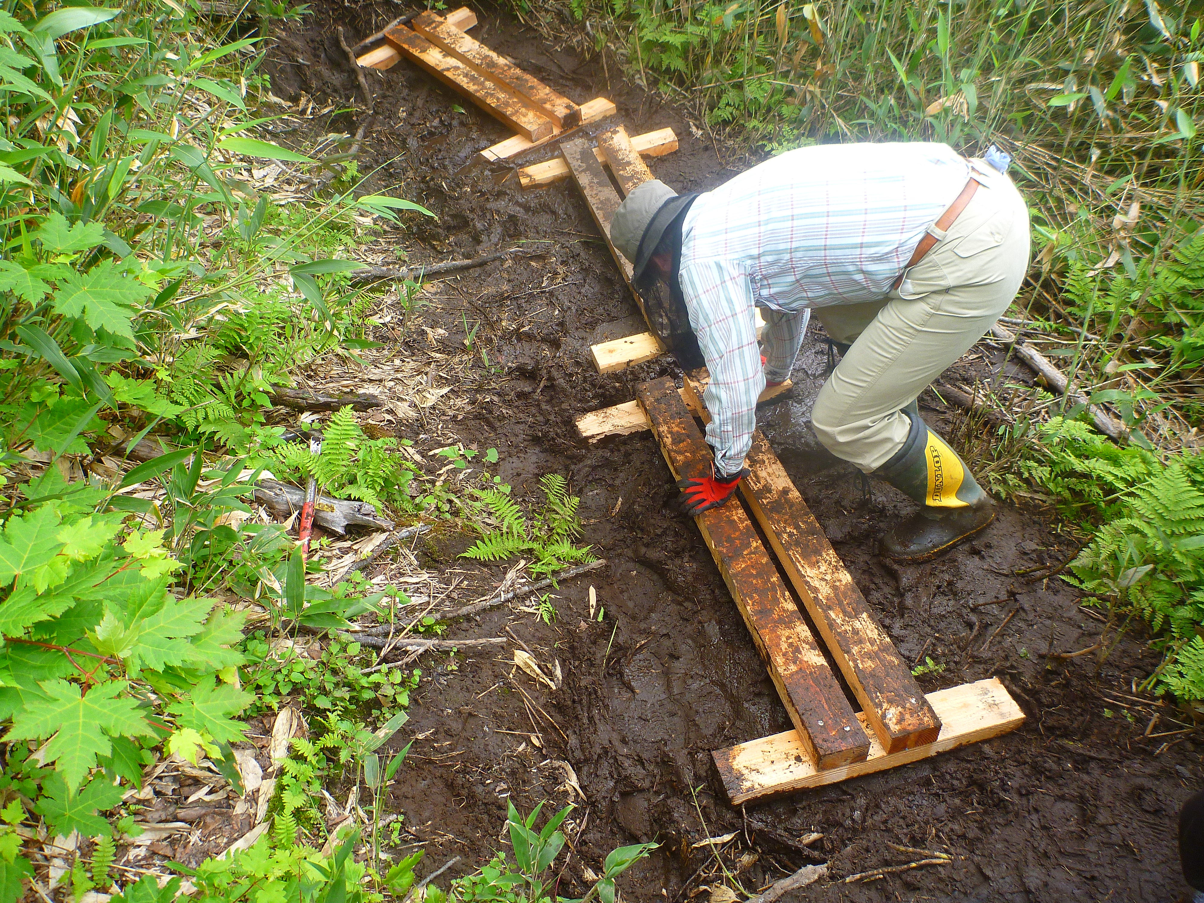 しかし、ササ原を切り開いたこの区間は融雪期や降雨直後にぬかるみがひどく、評判はよくありません。少しずつ整備を進めてきましたが一向に改善されません。ここは切れ目なく木道を敷きつなぐ方が、土が削られてぬかるみが作られることも抑えられるのではないか、そう考えられるようになりました。