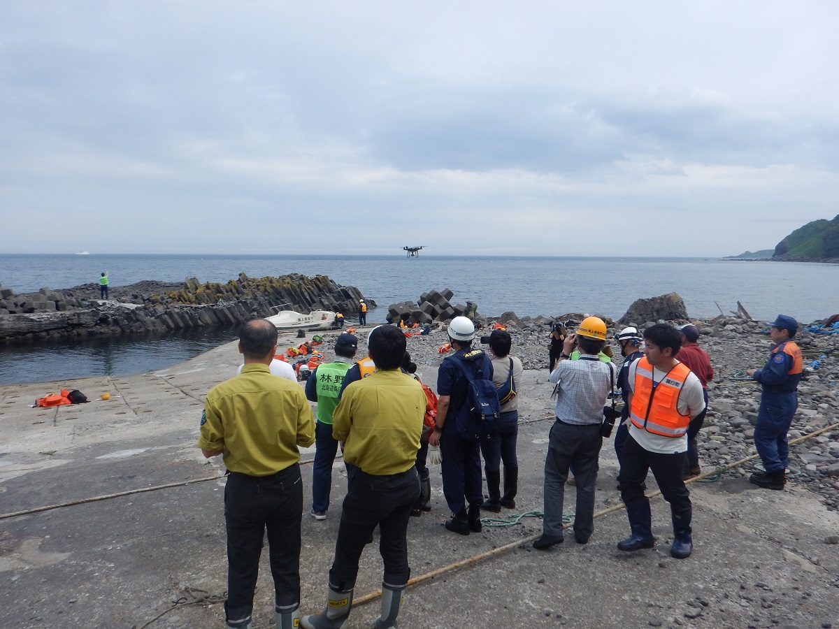 搭載艇を使用した人員の移送、ドローンによる救助訓練が行われ、今後関係団体とどのような連携が組めるのか話し合われました。1人の命を救うため、多くの人員、時間、物資等が使われることを身にしみて感じた訓練でした。