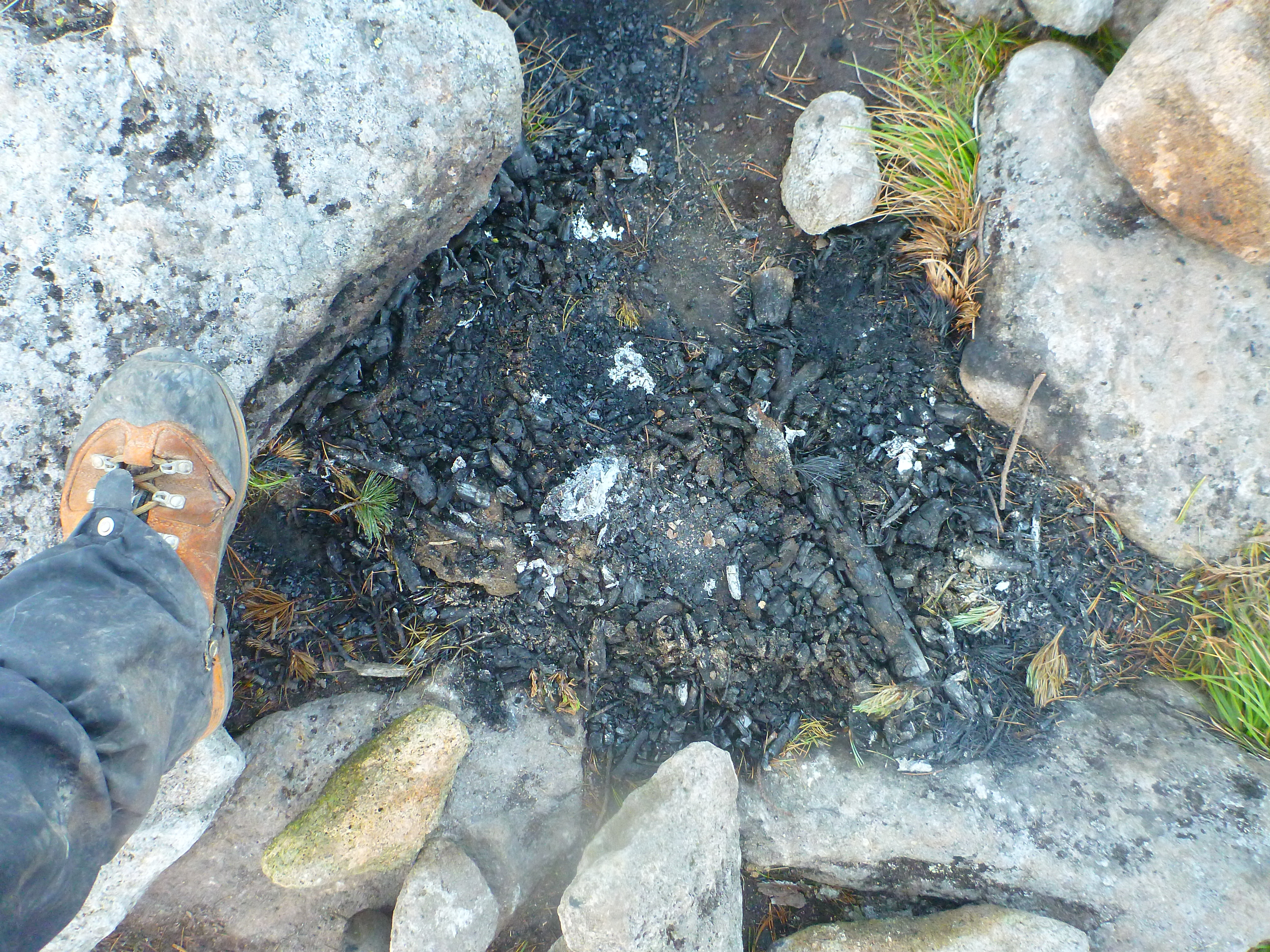 昨年も同じ場所で小さなたき火の痕が見つかっていました。きれいに取り除いたつもりでしたが、僅かな痕跡が、後から訪れたものに我も我もと思わせるのでしょうか。たまりにたまった痕跡なのでしょうか。楽しむだけ楽しんで後の始末は何もせず、防火意識の低さが気がかりです。いつか取り返しのつかない事態を招くのではないかと不安です。時間をかけて取り除きましたが、岩や土には炭の色が残っていました。これきり、たき火への欲求など呼び起こさないで欲しいものです。