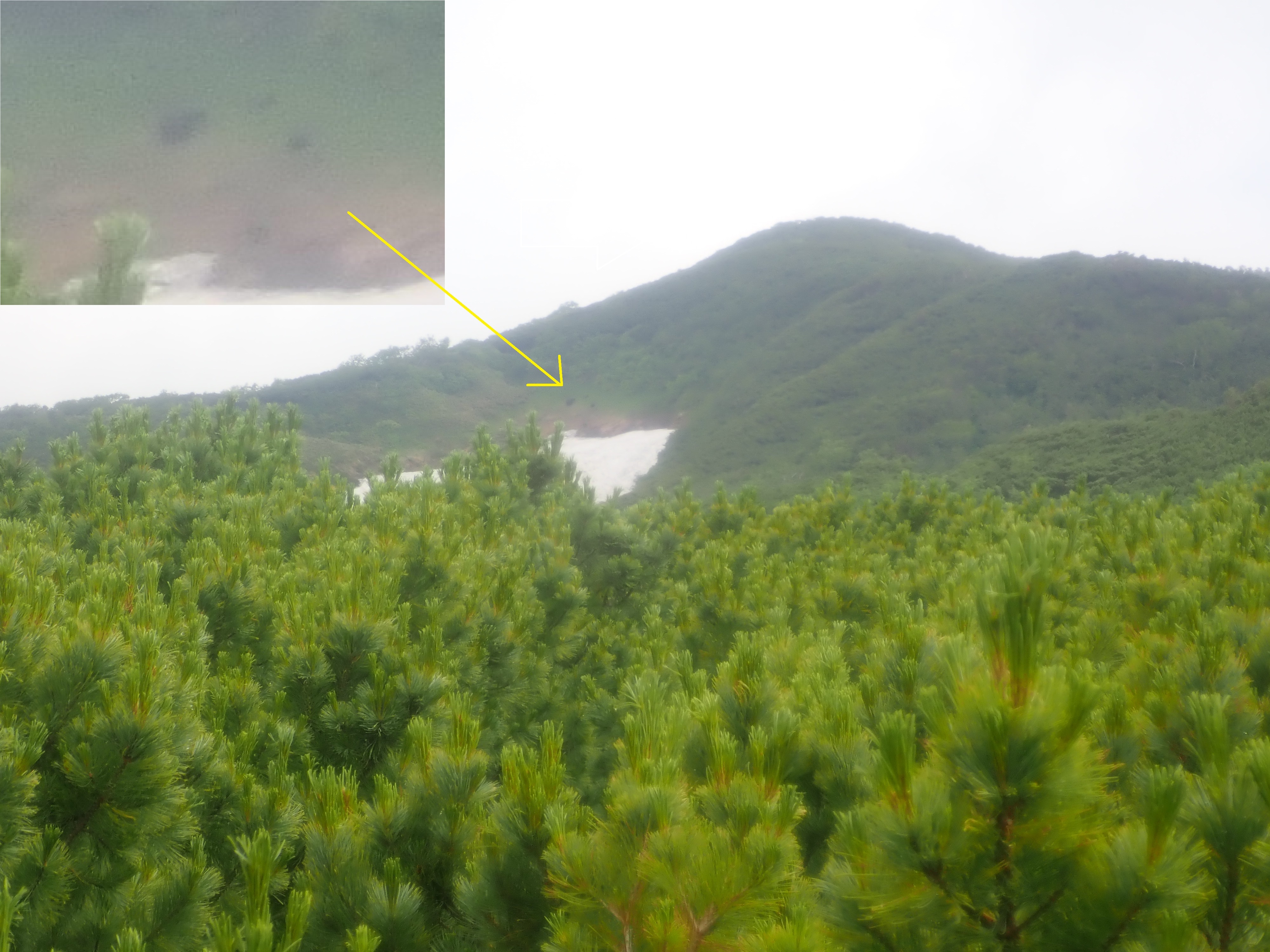 美瑛富士登山口から入山し、双子池で一泊。トムラウシ山へ行くため、十勝岳連峰の核心部でもあり、大雪山最奥地とも言えるコスマヌプリからつりがね山へ向かっている途中、ガス(濃霧)が切れた100mほど先の雪渓にいる母グマと2頭の子グマが見えました。