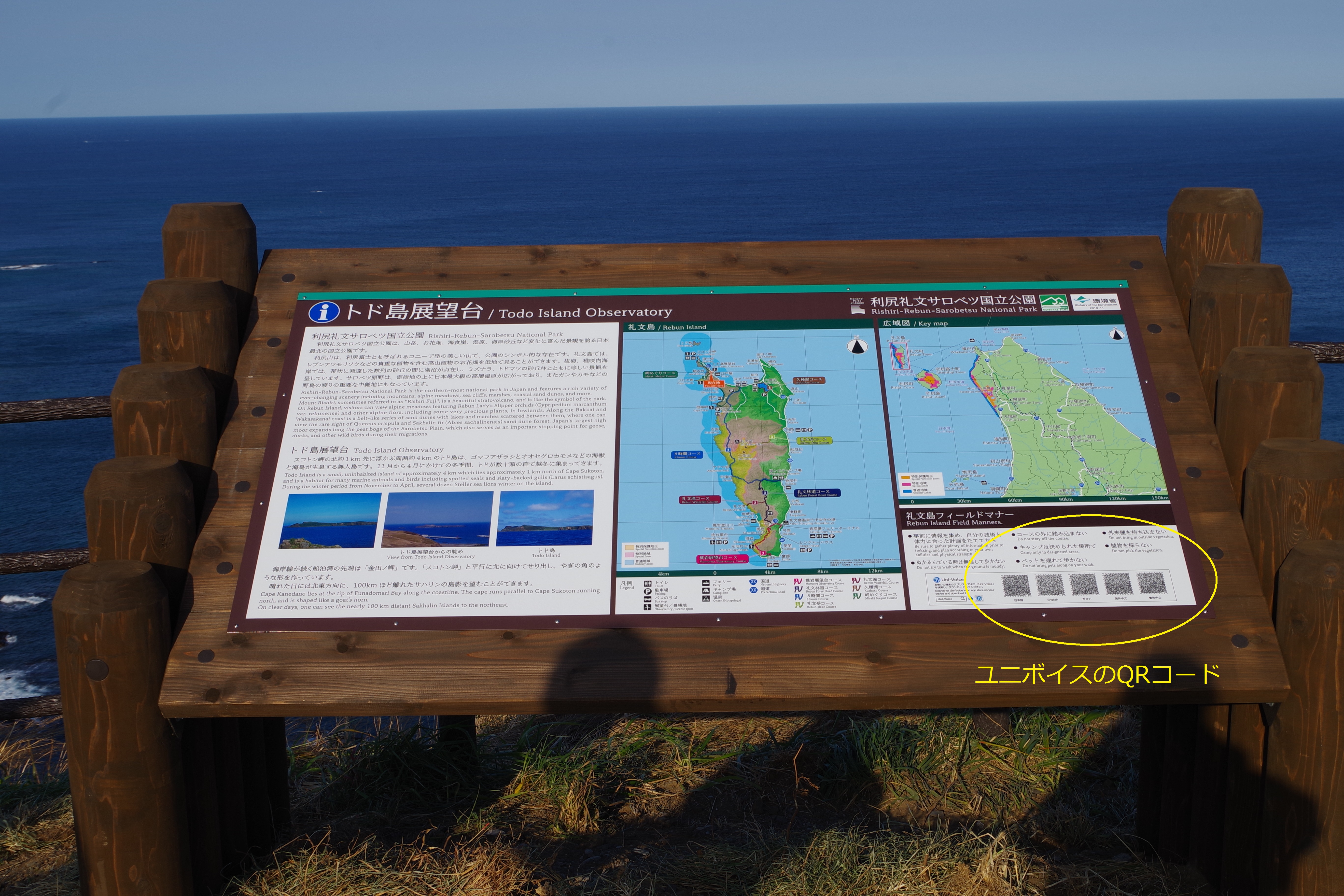 さらに!トド島展望台の案内看板はユニボイスつきとなっています。ユニボイスとは標識などに印刷されている2次元コード(QRコード)をケータイのカメラでかざすと...日本語、英語、その他の言語を自動で話すことや、読むことができます!例えば、標識に日本語だけの説明が書いてあっても、外国の方は読むことが困難ですが、ユニボイスを利用することで、そこに何が書いているのかを理解することができます!是非お越しの際は、新しくなった桃岩展望台コースを歩くと共に、標識や看板も確認してみて下さい(^^)