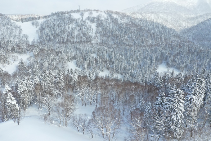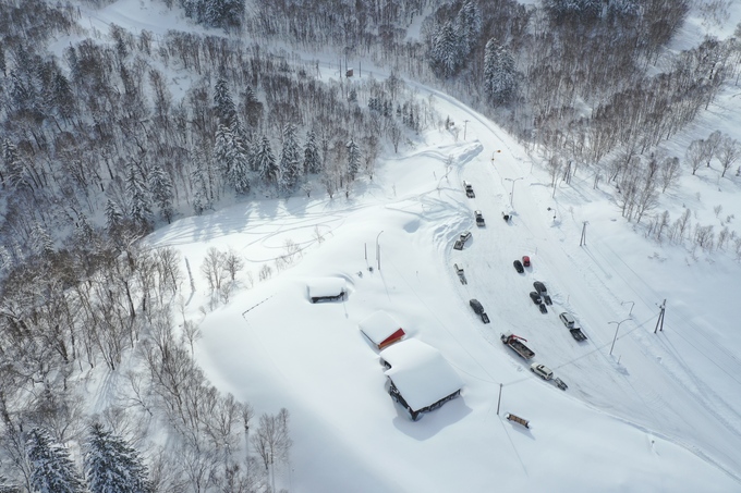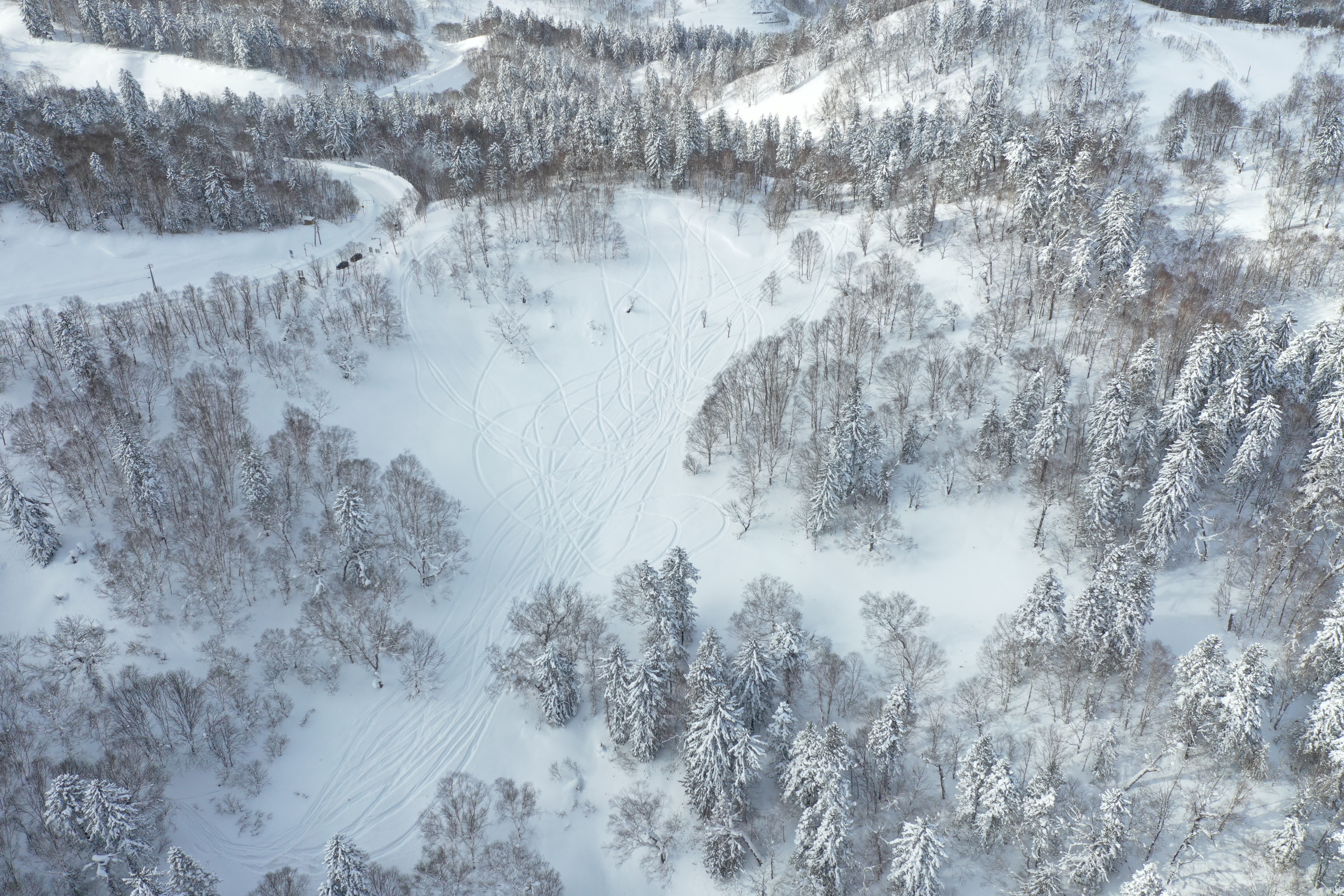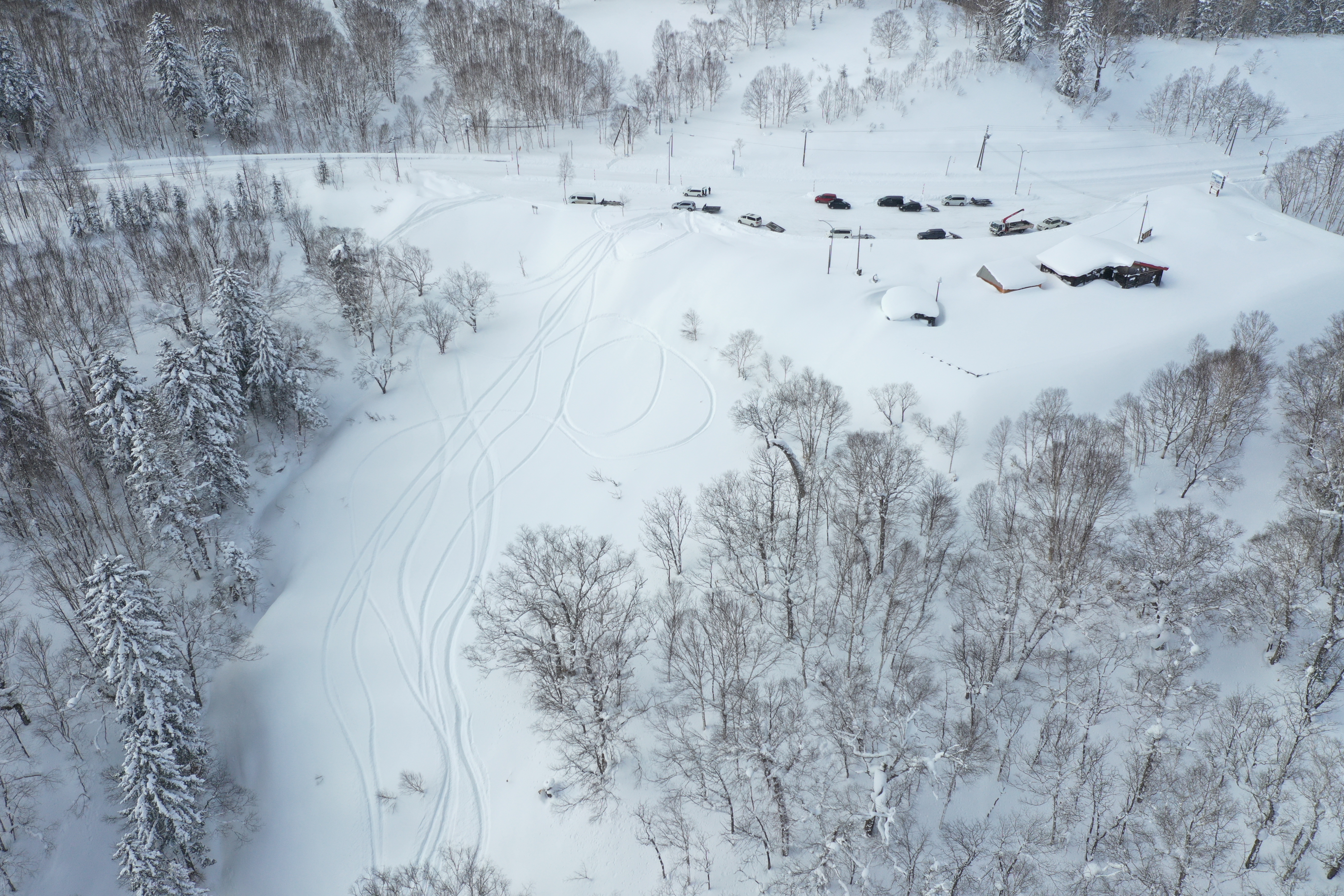 スノーモビルの走行痕が上空からハッキリと確認できます。