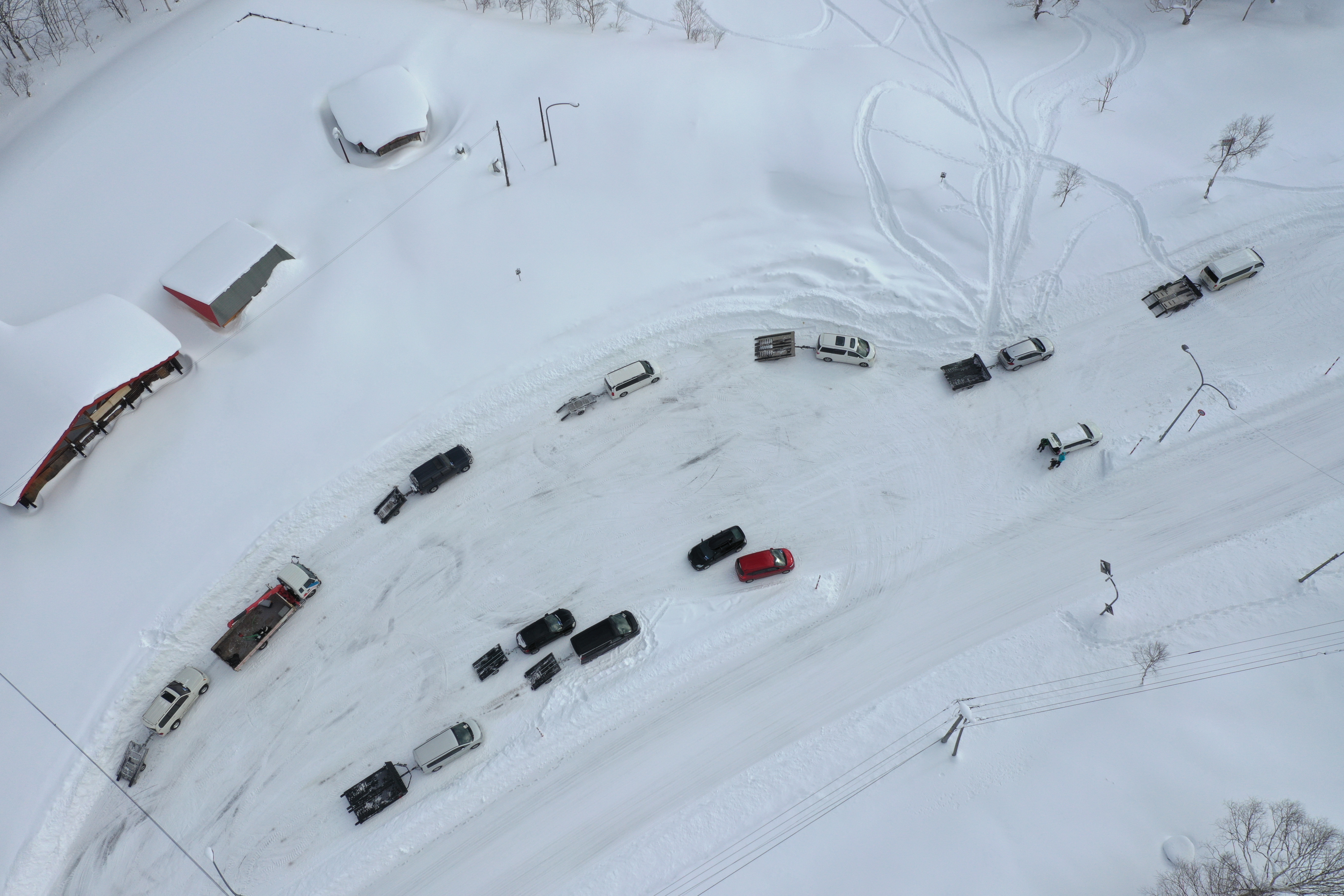 駐車帯にはスノーモビルの姿はなく、スノーモビルを牽引してきたと思われる車が10台残された状態で、遠くからはかすかにスノーモビルのエンジン音が聞こえ、駐車場には僅かに排気ガスのニオイがしていました。