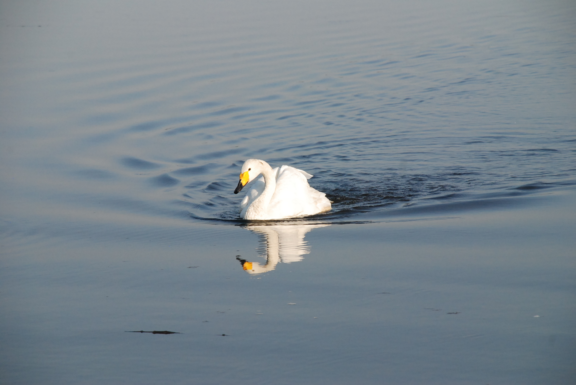 コハクチョウは、オオハクチョウよりも小さく、顎が太く短くなっています。上嘴基部の黄色はとがっていません。