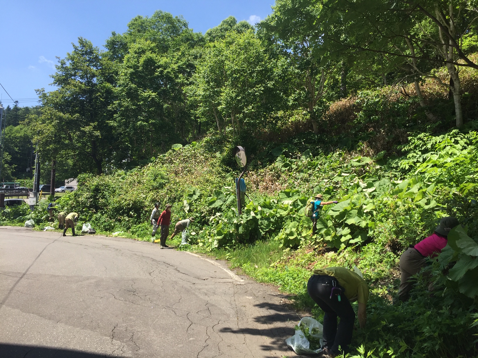 ところで、カゴ罠を仕掛けるだけの1日目は、然別湖畔にある南ペトウトル山登山口近くで北海道指定外来種イワミツバの防除に取り組みました。イワミツバは登山口に近い舗装道路の脇に30mほどに渡って生育しています。根絶するには張り巡らされた根ごと掘り取らなければなりませんが、湿った土のほかに砂利の混じったところもあって難しい。今回は可能な限り根ごと抜取り、それが難しい場所は広がった茎や葉を引きちぎりました。まだ、ごく狭い範囲に生育しているので、大きく広がらないうちに食い止めたいところです。